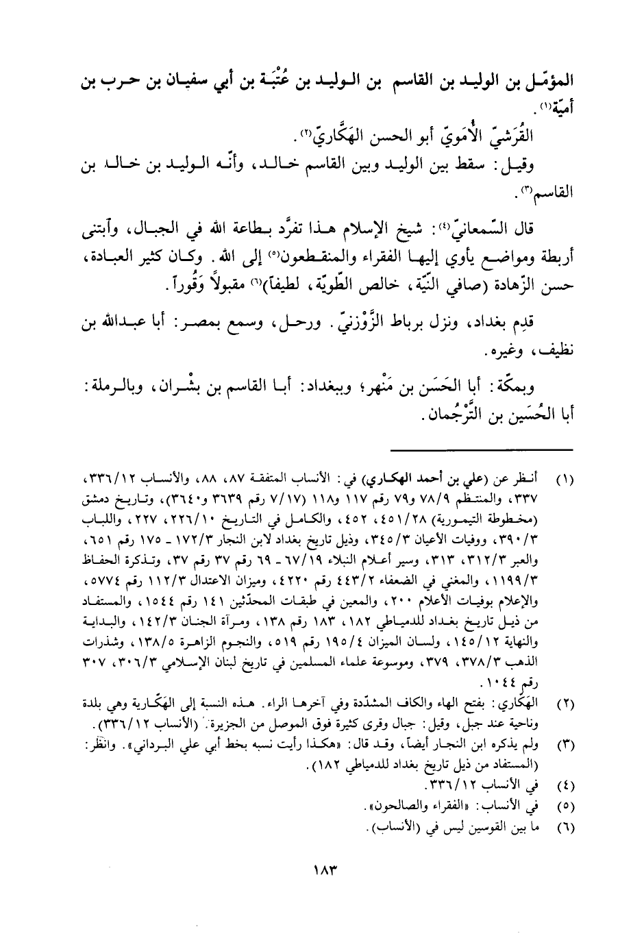 [2] الهكّاري: بفتح الهاء والكاف المشدّدة وفي آخرها الراء. هذه النسبة إلى الهكّارية وهي بلدة وناحية عند جبل، وقيل: جبال وقرى كثيرة فوق الموصل من الجزيرة. (الأنساب 12/ 336) .