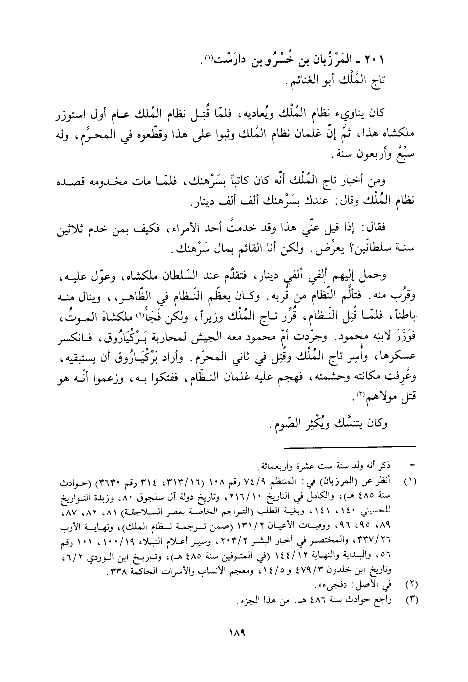 [1] انظر عن (المرزبان) في: المنتظم 9/ 74 رقم 108 (16/ 313، 314 رقم 3630) (حوادث سنة 485 هـ) ، والكامل في التاريخ 10/ 216، وتاريخ دولة آل سلجوق 80، وزبدة التواريخ للحسيني 140، 141، وبغية الطلب (التراجم الخاصة بعصر السلاجقة) 81، 82، 87، 89، 95، 96، ووفيات الأعيان 2/ 131 (ضمن ترجمة نظام الملك) ، ونهاية الأرب 26/ 337، والمختصر في أخبار البشر 2/ 203، وسير أعلام النبلاء 19/ 100، 101 رقم 56، والبداية والنهاية 12/ 144 (في المتوفين سنة 485 هـ) ، وتاريخ ابن الوردي 2/ 6، وتاريخ ابن خلدون 3/ 479 و 5/ 14، ومعجم الأنساب والأسرات الحاكمة 338.