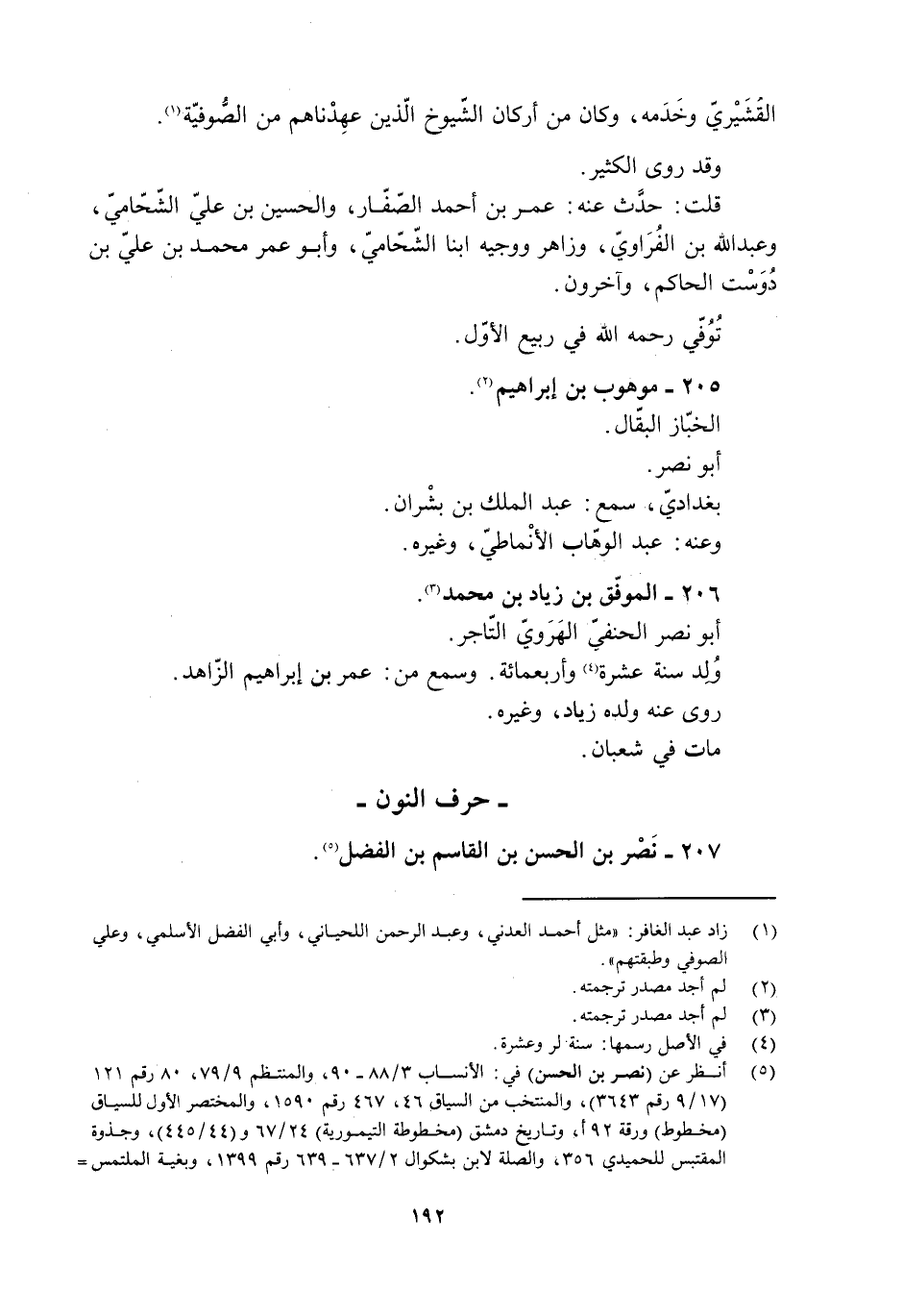 [5] انظر عن (نصر بن الحسن) في: الأنساب 3/ 88- 90، والمنتظم 9/ 79، 80 رقم 121 (17/ 9 رقم 3643) ، والمنتخب من السياق 46، 467 رقم 1590، والمختصر الأول للسياق (مخطوط) ورقة 92 أ، وتاريخ دمشق (مخطوطة التيمورية) 24/ 67 و (44/ 445) ، وجذوة المقتبس للحميدي 356، والصلة لابن بشكوال 2/ 637- 639 رقم 1399، وبغية الملتمس