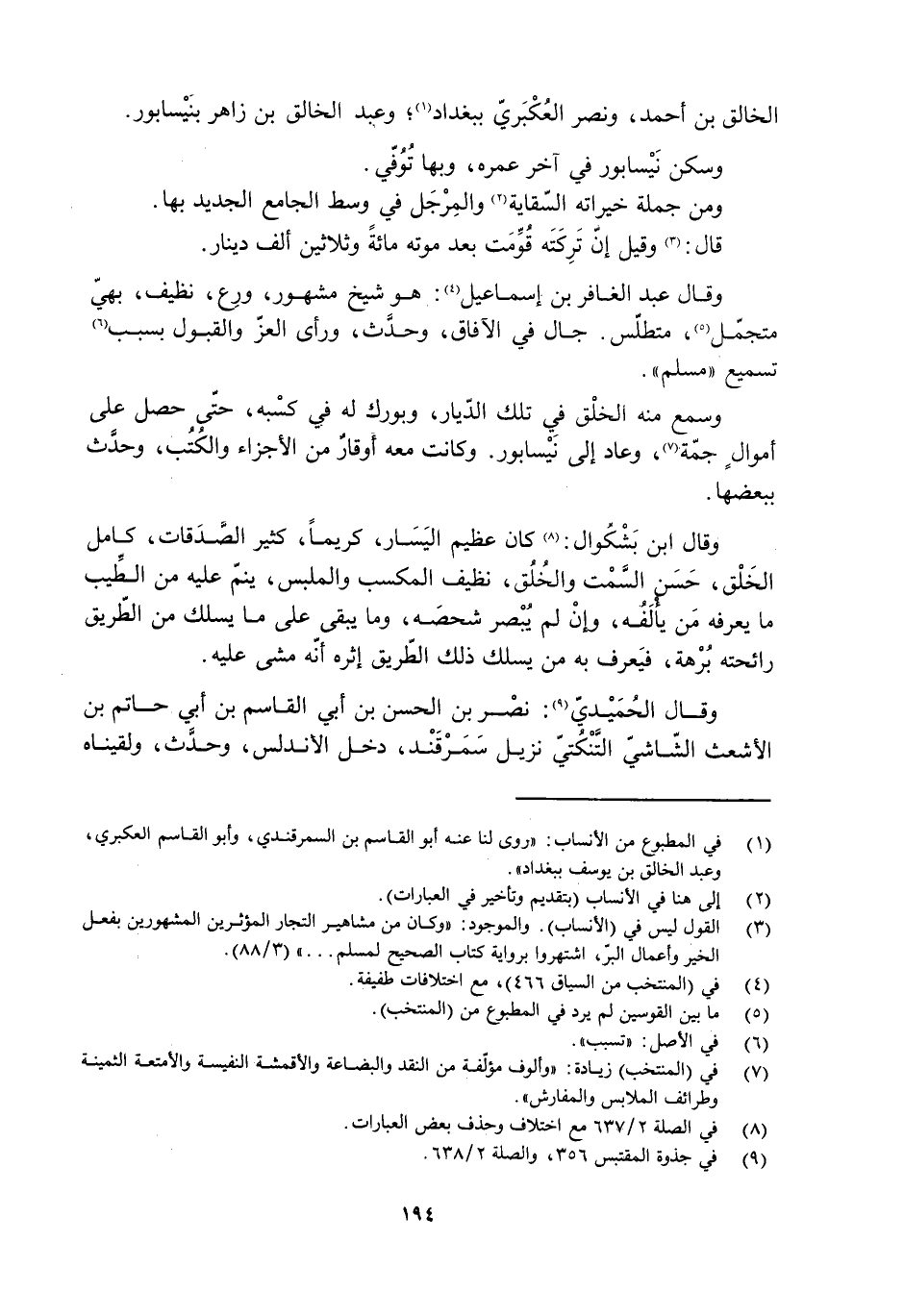 [3] القول ليس في (الأنساب) . والموجود: «وكان من مشاهير التجار المؤثرين المشهورين بفعل الخير وأعمال البرّ، اشتهروا برواية كتاب الصحيح لمسلم ... » (3/ 88) .
