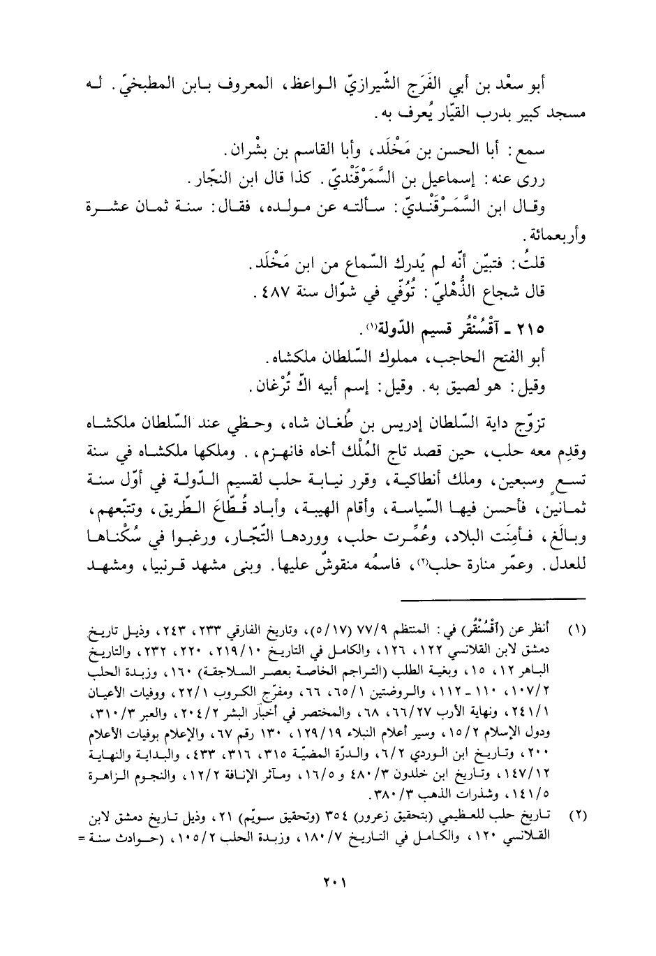 [2] تاريخ حلب للعظيميّ (بتحقيق زعرور) 354 (وتحقيق سويّم) 21، وذيل تاريخ دمشق لابن القلانسي 120، والكامل في التاريخ 7/ 180، وزبدة الحلب 2/ 105، (حوادث سنة