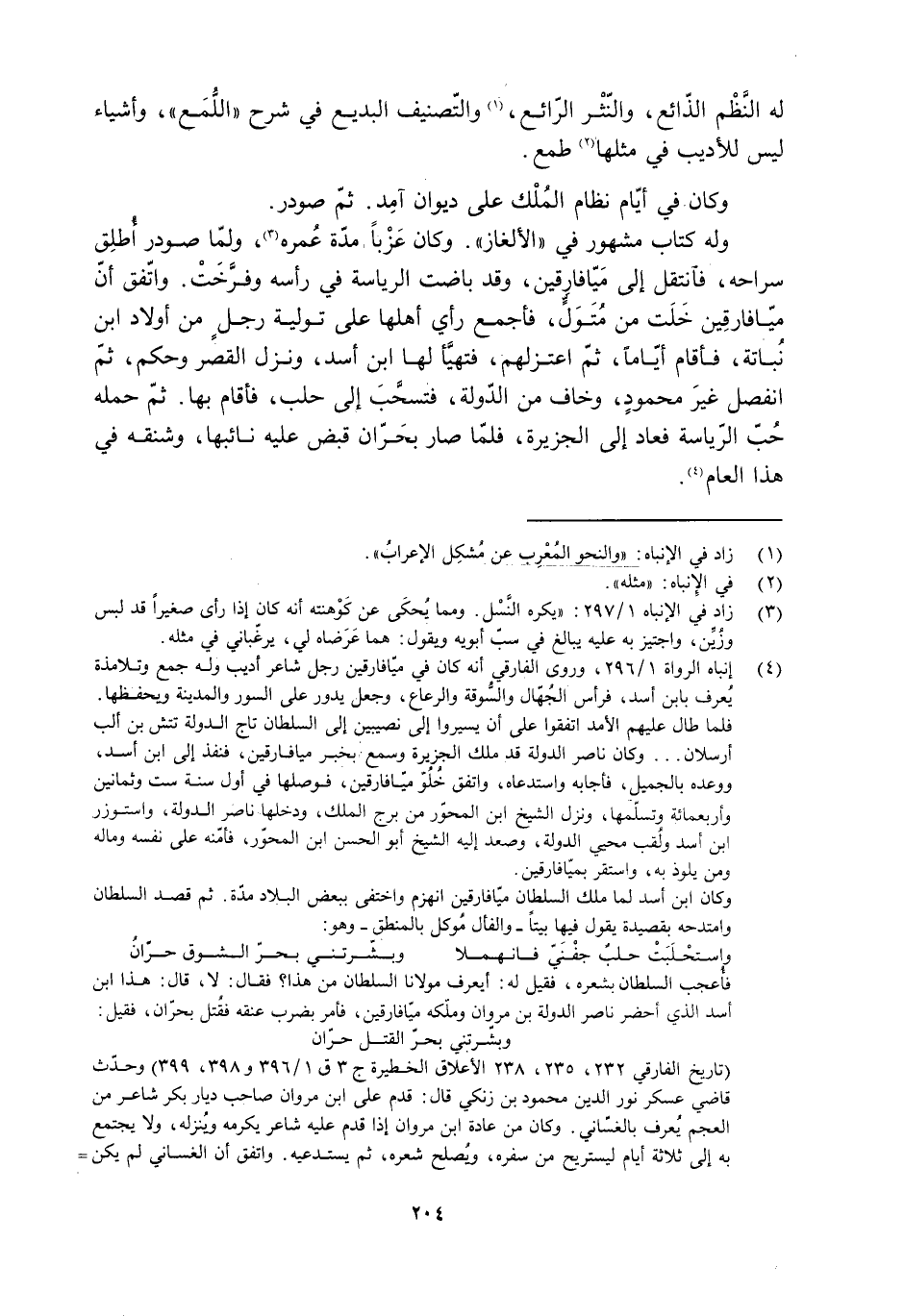 [4] إنباه الرواة 1/ 296، وروى الفارقيّ أنه كان في ميّافارقين رجل شاعر أديب وله جمع وتلامذة يعرف بابن أسد، فرأس الجهّال والسّوقة والرعاع، وجعل يدور على السور والمدينة ويحفظها.
