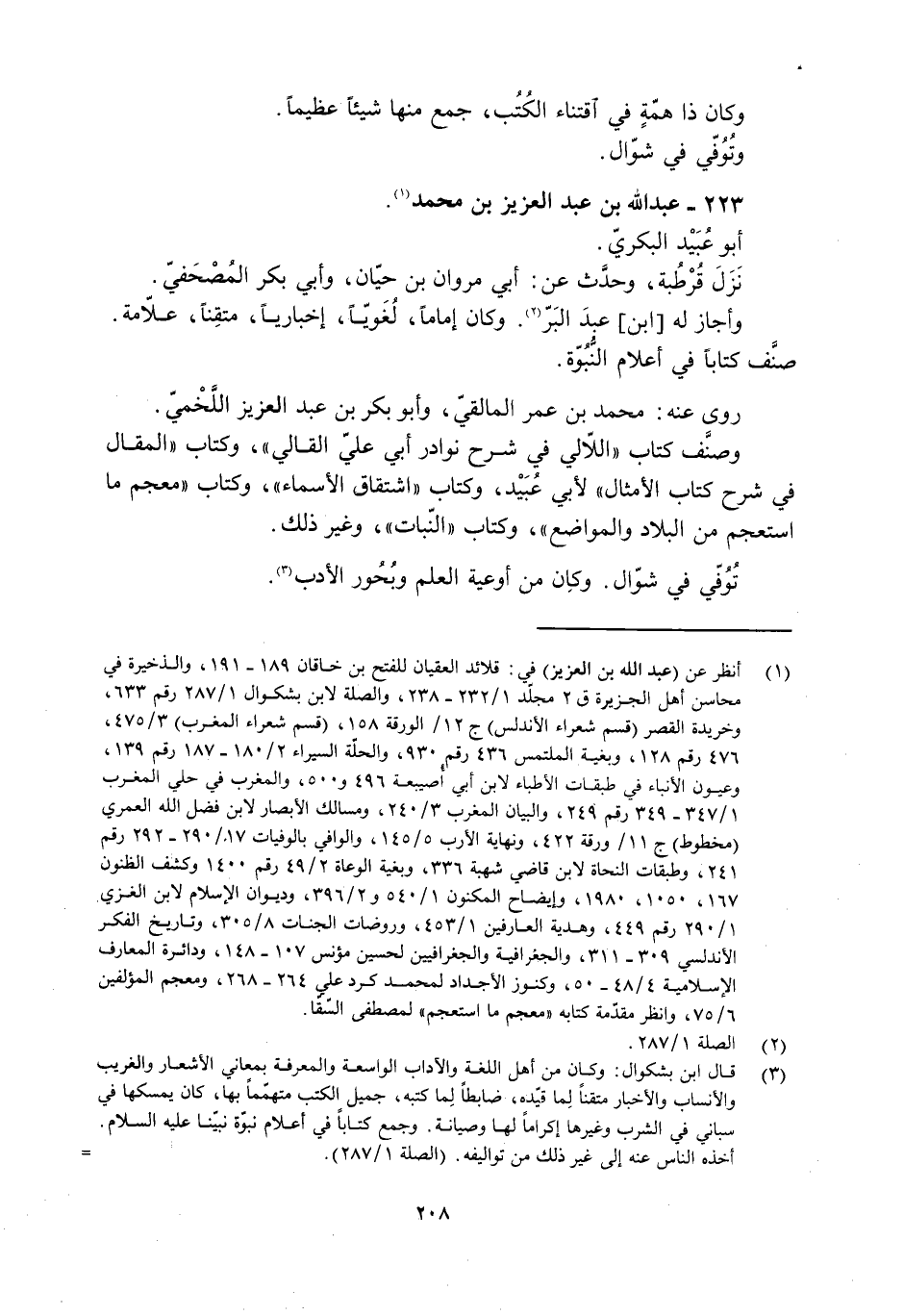 [1] انظر عن (عبد الله بن العزيز) في: قلائد العقيان للفتح بن خاقان 189- 191، والذخيرة في محاسن أهل الجزيرة ق 2 مجلّد 1/ 232- 238، والصلة لابن بشكوال 1/ 287 رقم 633، وخريدة القصر (قسم شعراء الأندلس) ج 12/ الورقة 158، (قسم شعراء المغرب) 3/ 475، 476 رقم 128، وبغية الملتمس 436 رقم 930، والحلّة السيراء 2/ 180- 187 رقم 139، وعيون الأنباء في طبقات الأطباء لابن أبي أصيبعة 496 و 500، والمغرب في حلي المغرب 1/ 347- 349 رقم 249، والبيان المغرب 3/ 240، ومسالك الأبصار لابن فضل الله العمري (مخطوط) ج 11/ ورقة 422، ونهاية الأرب 5/ 145، والوافي بالوفيات 17/ 290- 292 رقم 241، وطبقات النحاة لابن قاضي شهبة 336، وبغية الوعاة 2/ 49 رقم 1400 وكشف الظنون 167، 1050، 1980، وإيضاح المكنون 1/ 540 و 2/ 396، وديوان الإسلام لابن الغزي 1/ 290 رقم 449، وهدية العارفين 1/ 453، وروضات الجنات 8/ 305، وتاريخ الفكر الأندلسي 309- 311، والجغرافية والجغرافيين لحسين مؤنس 107- 148، ودائرة المعارف الإسلامية 4/ 48- 50، وكنوز الأجداد لمحمد كردعلي 264- 268، ومعجم المؤلفين 6/ 75، وانظر مقدّمة كتابه «معجم ما استعجم» لمصطفى السّقّاء.