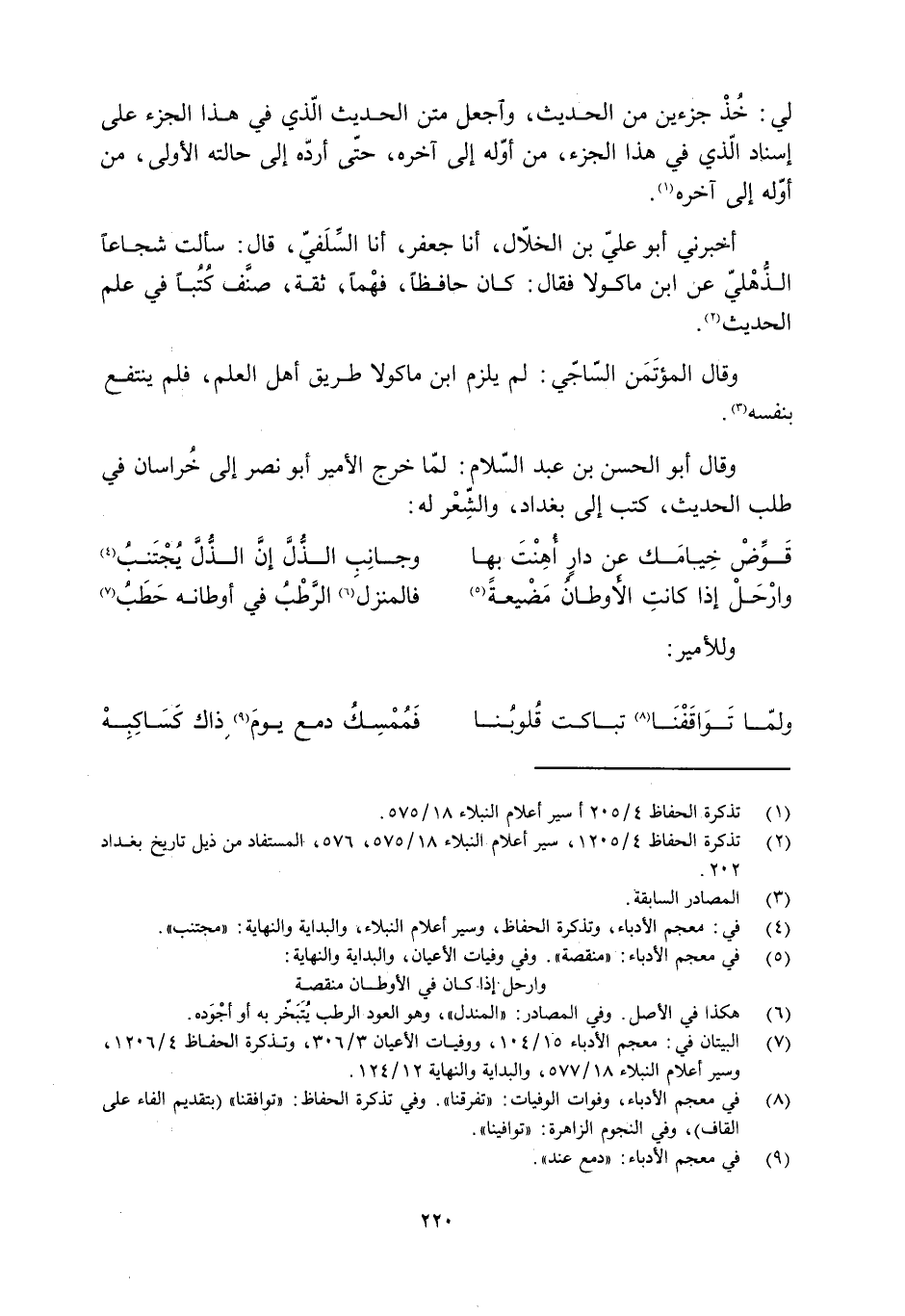 [8] في معجم الأدباء، وفوات الوفيات: «تفرقنا» . وفي تذكرة الحفاظ: «توافقنا» (بتقديم الفاء على القاف) ، وفي النجوم الزاهرة: «توافينا» .