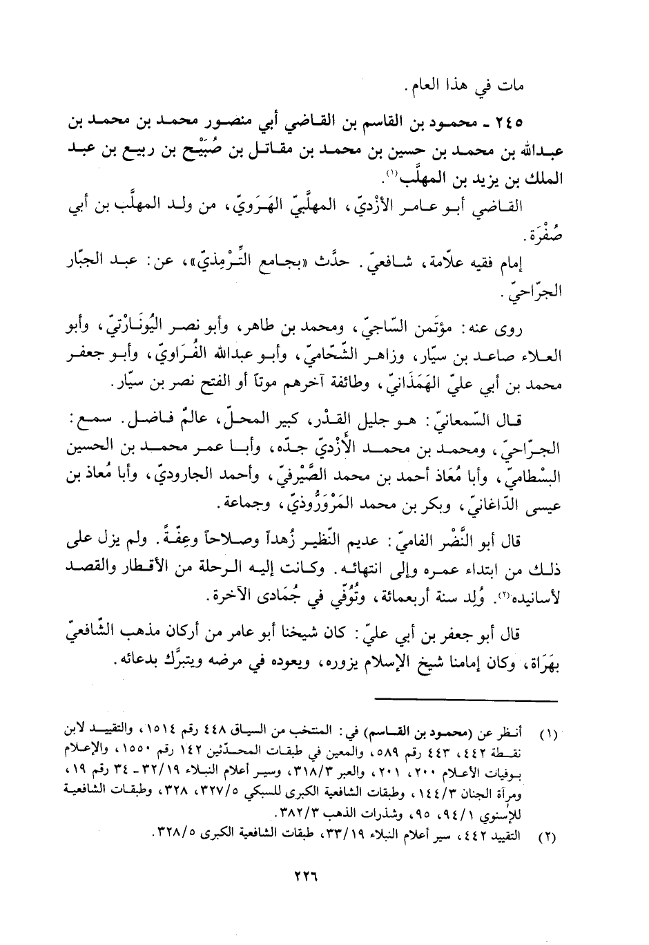 245- محمود بن القاسم بن القاضي أَبِي مَنْصُور مُحَمَّد بْن مُحَمَّدِ بْنِ عَبْدِ اللَّهِ بْنِ مُحَمَّدِ بْنِ حسين بن محمد بن مقاتل بن صُبَيْح بن ربيع بن عبد الملك بن يزيد بن المهلَّب [1] .