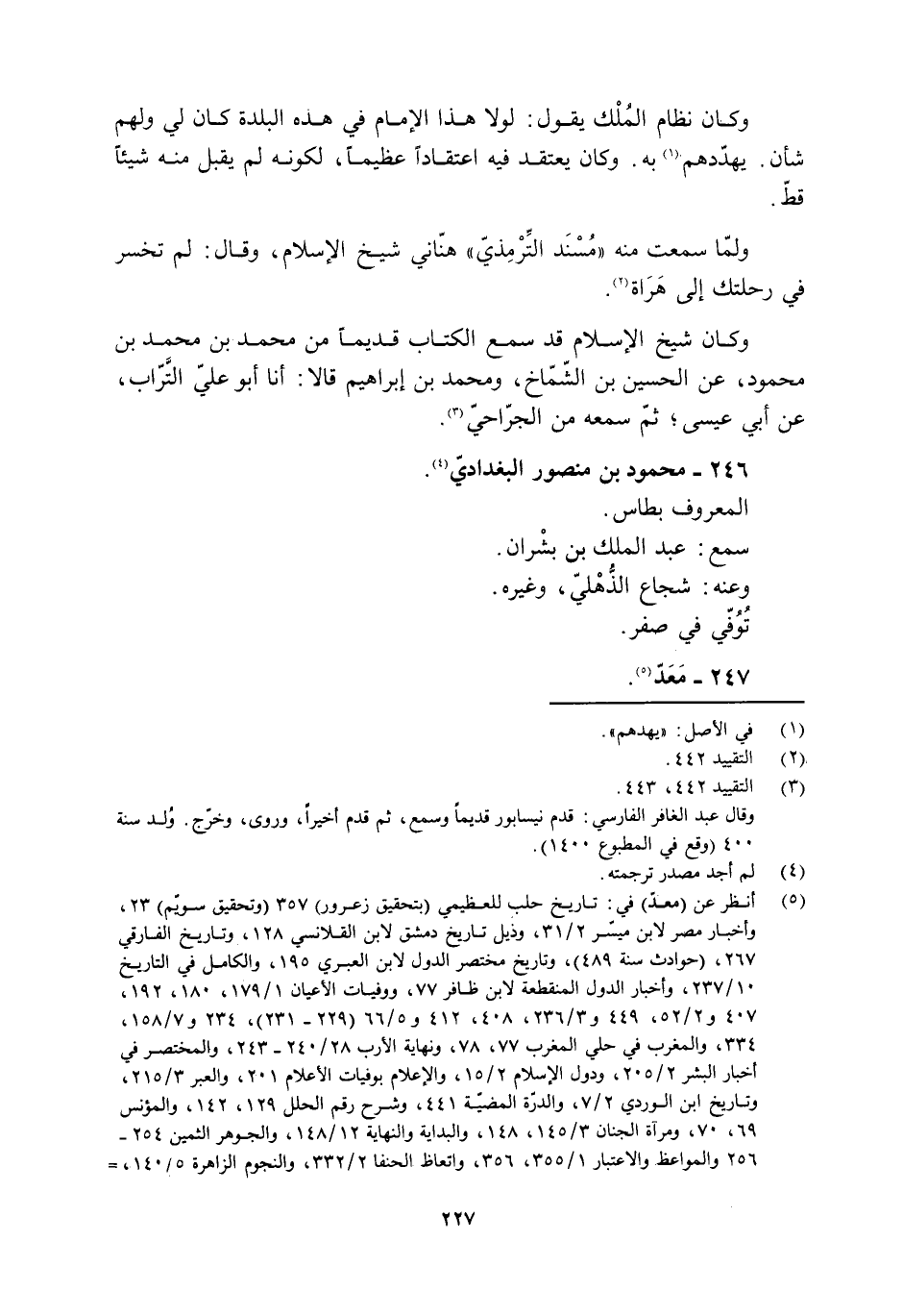 [5] انظر عن (معدّ) في: تاريخ حلب للعظيميّ (تحقيق زعرور) 357 (وتحقيق سويّم) 23، وأخبار مصر لابن ميسّر 2/ 31، وذيل تاريخ دمشق لابن القلانسي 128، وتاريخ الفارقيّ 267، (حوادث سنة 489) ، وتاريخ مختصر الدول لابن العبري 195، والكامل في التاريخ 10/ 237، وأخبار الدول المنقطعة لابن ظافر 77، ووفيات الأعيان 1/ 179، 180، 192، 407 و 2/ 52، 449 و 3/ 236، 408، 412 و 5/ 66 (229- 231) ، 234 و 7/ 158، 334، والمغرب في حلي المغرب 77، 78، ونهاية الأرب 28/ 240- 243، والمختصر في أخبار البشر 2/ 205، ودول الإسلام 2/ 15، والإعلام بوفيات الأعلام 201، والعبر 3/ 215، وتاريخ ابن الوردي 2/ 7، والدرّة المضيّة 441، وشرح رقم الحلل 129، 142، والمؤنس 69، 70، ومرآة الجنان 3/ 145، 148، والبداية والنهاية 12/ 148، والجوهر الثمين 254- 256 والمواعظ والاعتبار 1/ 355، 356، واتعاظ الحنفا 2/ 332، والنجوم الزاهرة 5/ 140،