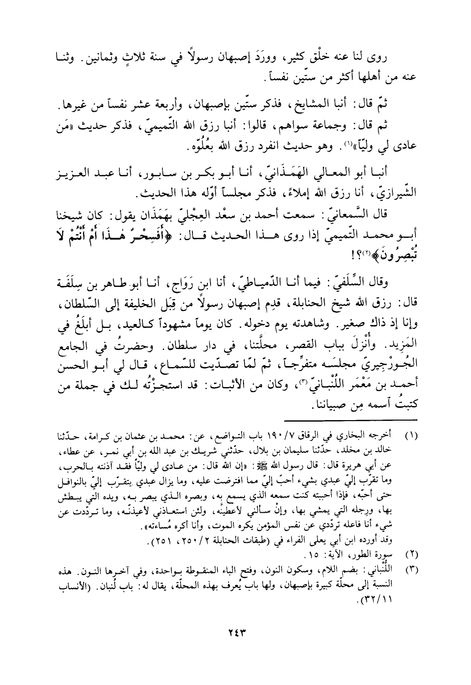 ثُمّ قَالَ: وَجَمَاعَةٌ سِوَاهُمْ، قَالُوا: أنبا رِزْقُ اللَّهِ التَّمِيمِيُّ، فَذَكَرَ حَدِيثَ «مَنْ عَادَى لِي وَلِيًّا» [1] . وَهُوَ حَدِيثٌ انْفَرَد رِزْقُ اللَّهِ بِعُلُوِّهِ.
