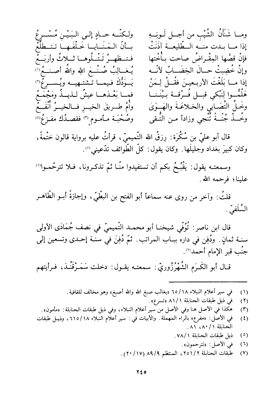 [7] طبقات الحنابلة 2/ 251، المنتظم 9/ 89 (17/ 20) .