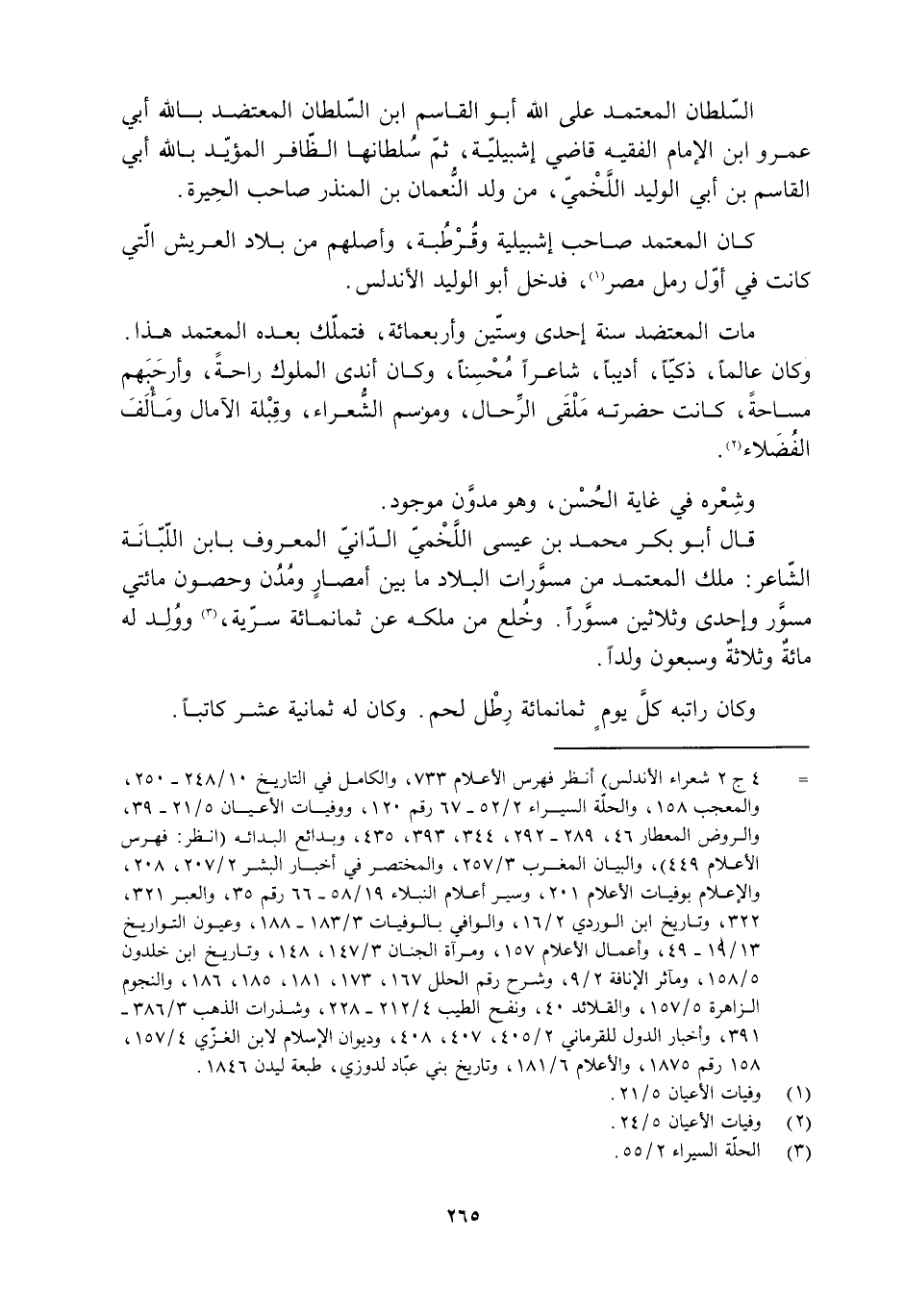 [4] ج 2 شعراء الأندلس) انظر فهرس الأعلام 733، والكامل في التاريخ 10/ 248- 250، والمعجب 158، والحلّة السيراء 2/ 52- 67 رقم 120، ووفيات الأعيان 5/ 21- 39، والروض المعطار 46، 289- 292، 344، 393، 435، وبدائع البدائه (انظر: فهرس الأعلام 449) ، والبيان المغرب 3/ 257، والمختصر في أخبار البشر 2/ 207، 208، والإعلام بوفيات الأعلام 201، وسير أعلام النبلاء 19/ 58- 66 رقم 35، والعبر 321، 322، وتاريخ ابن الوردي 2/ 16، والوافي بالوفيات 3/ 183- 188، وعيون التواريخ 13/ 19- 49، وأعمال الأعلام 157، ومرآة الجنان 3/ 147، 148، وتاريخ ابن خلدون 5/ 158، ومآثر الإنافة 2/ 9، وشرح رقم الحلل 167، 173، 181، 185، 186، والنجوم الزاهرة 5/ 157، والقلائد 40، ونفح الطيب 4/ 212- 228، وشذرات الذهب 3/ 386- 391، وأخبار الدول للقرماني 2/ 405، 407، 408، وديوان الإسلام لابن الغزّي 4/ 157، 158 رقم 1875، والأعلام 6/ 181، وتاريخ بني عبّاد لدوزي، طبعة ليدن 1846.