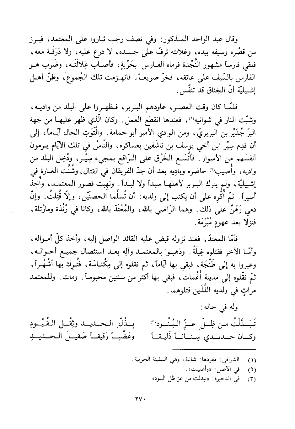 فلمّا كان وقت العصر، عاودهم البربر، فظهروا على البلد من واديه، وشبّت النّار في شوانيه [1] ، فعندها انقطع العمل. وكان الّذي ظهر عليها من جهة البَرّ جُدَيْر بن البربريّ، ومن الوادي الأمير أبو حمامة. والْتَوَتِ الحال أيّامًا، إلى أن قدِم سِير ابن أخي يوسف بن تاشَفِين بعساكره، والنّاسُ في تلك الأيّام يرمون أنفسهم من الأسوار. فاتَّسع الخَرْق على الرّاقع بمجيء سِير، ودُخِل البلد من واديه، وأُصيب [2] حاضره وبادِيه بعد أن جدّ الفريقان في القتال، وشُنَّت الغارة في إشبيليّة، ولم يترك البربر لأهلها سبدًا ولا لبدًا. ونُهِبت قصور المعتمد، وأُخِذ أسيرًا. ثمّ أُكْرِه على أن يكتب إلى ولديه: أن تُسلِّما الحصنَيْن، وإلّا قُتِلتُ. وإنّ دمي رَهْنٌ على ذلك. وهما الرّاضي باللَّه، والمُعْتدّ باللَّه، وكانا في رُنْدَة ومارْتلة، فنزلا بعد عهودٍ مُبْرمَة.