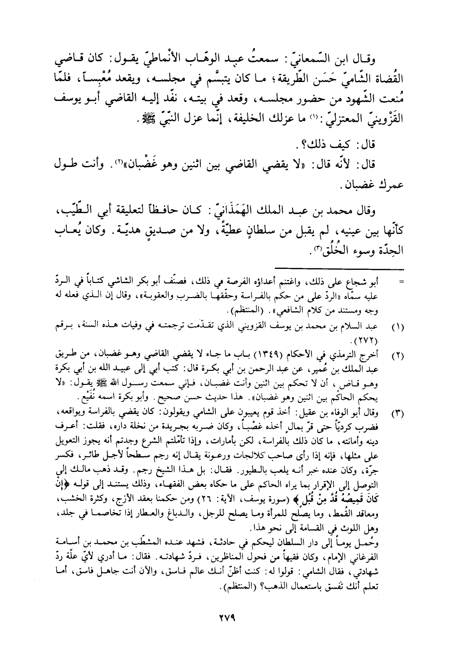 [3] وقال أبو الوفاء بن عقيل: أخذ قوم يعيبون على الشامي ويقولون: كان يقضي بالفراسة ويواقعه، فضرب كرديّا حتى قرّ بمال أخذه غصبا، وكان ضربه بجريدة من نخلة داره، فقلت: أعرف دينه وأمانته، ما كان ذلك بالفراسة، لكن بأمارات، وإذا تأمّلتم الشرع وجدتم أنه يجوز التعويل على مثلها، فإنه إذا رأى صاحب كلالجات ورعونة يقال إنه رجم سطحا لأجل طائر، فكسر جرّة، وكان عنده خبر أنه يلعب بالطيور. فقال: بل هذا الشيخ رجم. وقد ذهب مالك إلى التوصل إلى الإقرار بما يراه الحاكم على ما حكاه بعض الفقهاء، وذلك يستند إلى قوله إِنْ كانَ قَمِيصُهُ قُدَّ من قُبُلٍ 12: 26 (سورة يوسف، الآية: 26) ومن حكمنا بعقد الأزج، وكثرة الخشب، ومعاقد القمط، وما يصلح للمرأة وما يصلح للرجل، والدباغ والعطار إذا تخاصما في جلد، وهل اللوث في القسامة إلى نحو هذا.