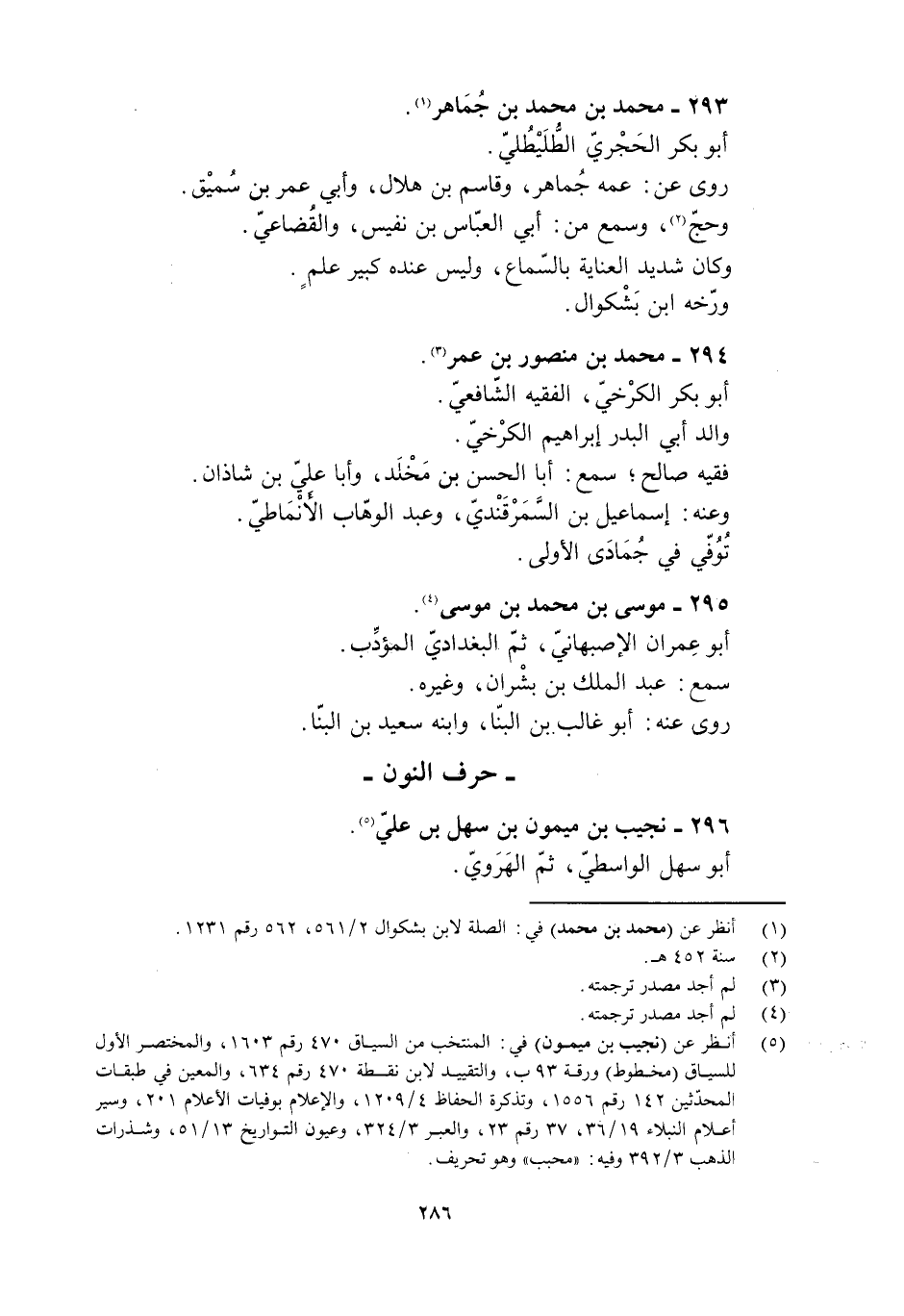 [5] انظر عن (نجيب بن ميمون) في: المنتخب من السياق 470 رقم 1603، والمختصر الأول للسياق (مخطوط) ورقة 93 ب، والتقييد لابن نقطة 470 رقم 634، والمعين في طبقات المحدّثين 142 رقم 1556، وتذكرة الحفاظ 4/ 1209، والإعلام بوفيات الأعلام 201، وسير أعلام النبلاء 19/ 36، 37 رقم 23، والعبر 3/ 324، وعيون التواريخ 13/ 51، وشذرات الذهب 3/ 392 وفيه: «محبب» وهو تحريف.