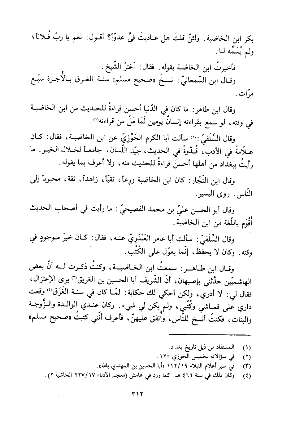وقال ابن طاهر: سمعتُ ابن الخاضبة، وكنتُ ذكرت له أنّ بعض الهاشميّين حدَّثني بإصبهان، أنّ الشّريف أبا الحسين بن الغريق [3] يرى الاعتزال، فقال لي: لا أدري، ولكن أحكي لك حكاية: لمّا كان في سنة الغَرَق [4] وقعت داري على قماشي وكُتُبي، ولم يكن لي شيء. وكان عندي الوالدة والزّوجة والبنات، فكنتُ أنسخ للنّاس، وأُنفق عليهنّ، فأعرف أنّني كتبتُ «صحيح مسلم»