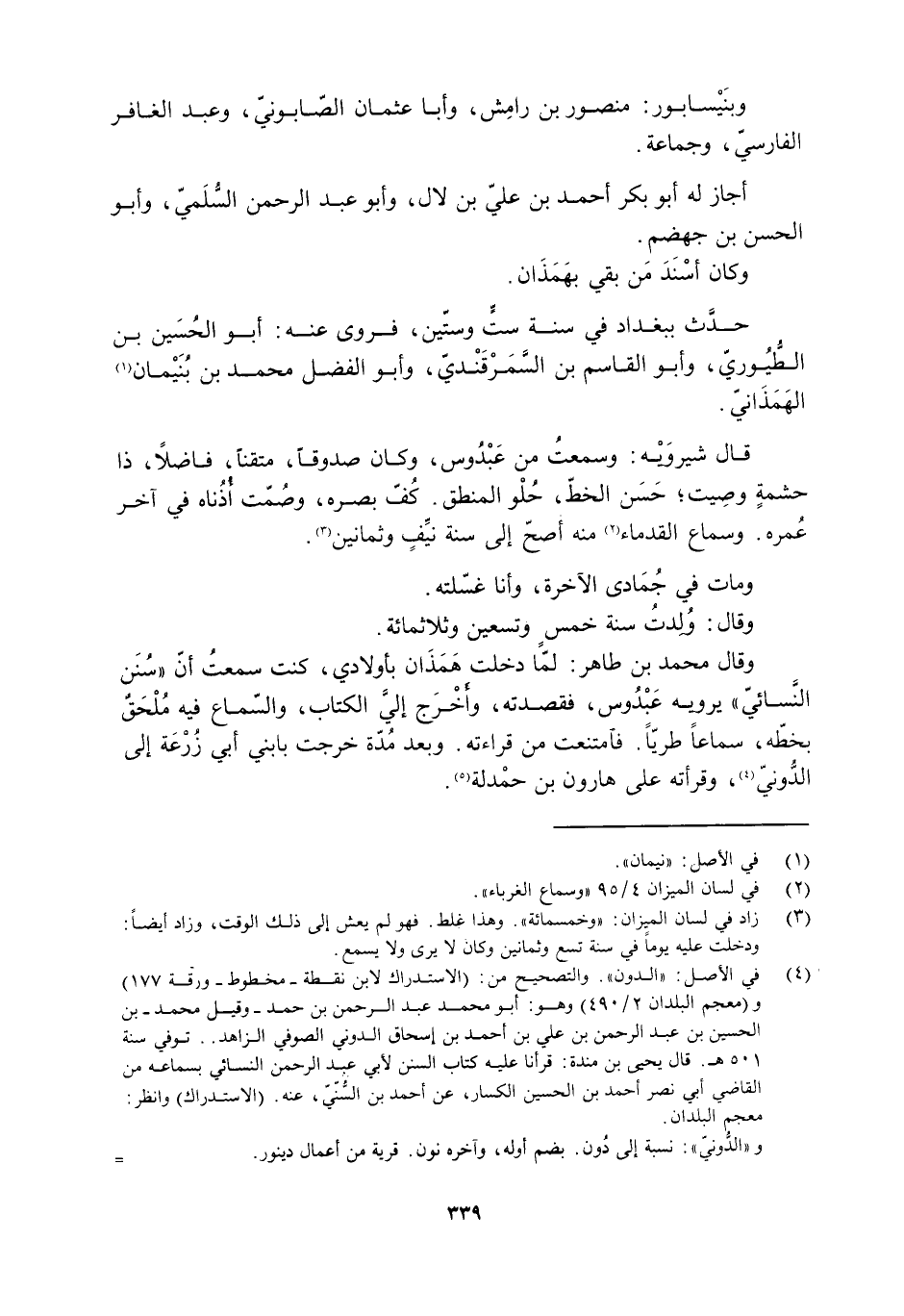 [3] زاد في لسان الميزان: «وخمسمائة» . وهذا غلط. فهو لم يعش إلى ذلك الوقت، وزاد أيضا: