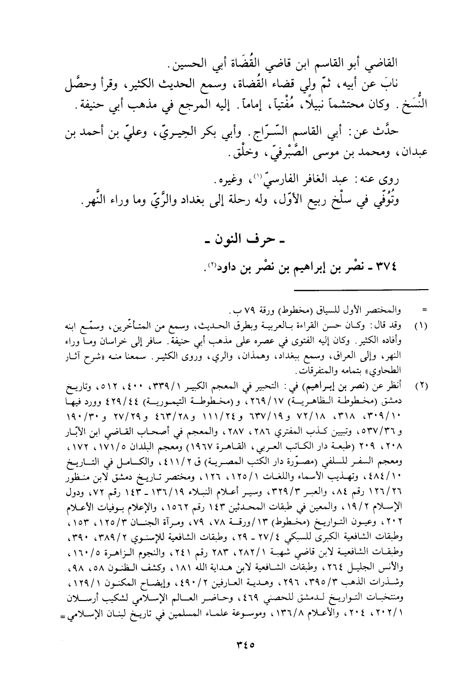 [2] انظر عن (نصر بن إبراهيم) في: التحبير في المعجم الكبير 1/ 339، 400، 512، وتاريخ دمشق (مخطوطة الظاهرية) 17/ 269، و (مخطوطة التيمورية) 44/ 429 وورد فيها 10/ 309، 318، 18/ 72 و 19/ 637 و 24/ 111 و 28/ 463 و 29/ 27 و 30/ 190 و 36/ 537، وتبين كذب المفتري 286، 287، والمعجم في أصحاب القاضي ابن الأبّار 208، 209 (طبعة دار الكاتب العربيّ، القاهرة 1967) ومعجم البلدان 5/ 171، 172، ومعجم السفر للسلفي (مصوّرة دار الكتب المصرية) ق 2/ 411، والكامل في التاريخ 10/ 484، وتهذيب الأسماء واللغات 1/ 125، 126، ومختصر تاريخ دمشق لابن منظور 26/ 126 رقم 84، والعبر 3/ 329، وسير أعلام النبلاء 19/ 136- 143 رقم 72، ودول الإسلام 2/ 19، والمعين في طبقات المحدثين 143 رقم 1562، والإعلام بوفيات الأعلام 202، وعيون التواريخ (مخطوط) 13/ ورقة 78، 79، ومرآة الجنان 3/ 125، 153، وطبقات الشافعية الكبرى للسبكي 4/ 27- 29، وطبقات الشافعية للإسنويّ 2/ 389، 390، وطبقات الشافعية لابن قاضي شهبة 1/ 282، 283 رقم 241، والنجوم الزاهرة 5/ 160، والأنس الجليل 264، وطبقات الشافعية لابن هداية الله 181، وكشف الظنون 58، 98، وشذرات الذهب 3/ 395، 296، وهدية العارفين 2/ 490، وإيضاح المكنون 1/ 129، ومنتخبات التواريخ لدمشق للحصني 469، وحاضر العالم الإسلامي لشكيب أرسلان 1/ 202، 204، والأعلام 8/ 136، وموسوعة علماء المسلمين في تاريخ لبنان الإسلامي