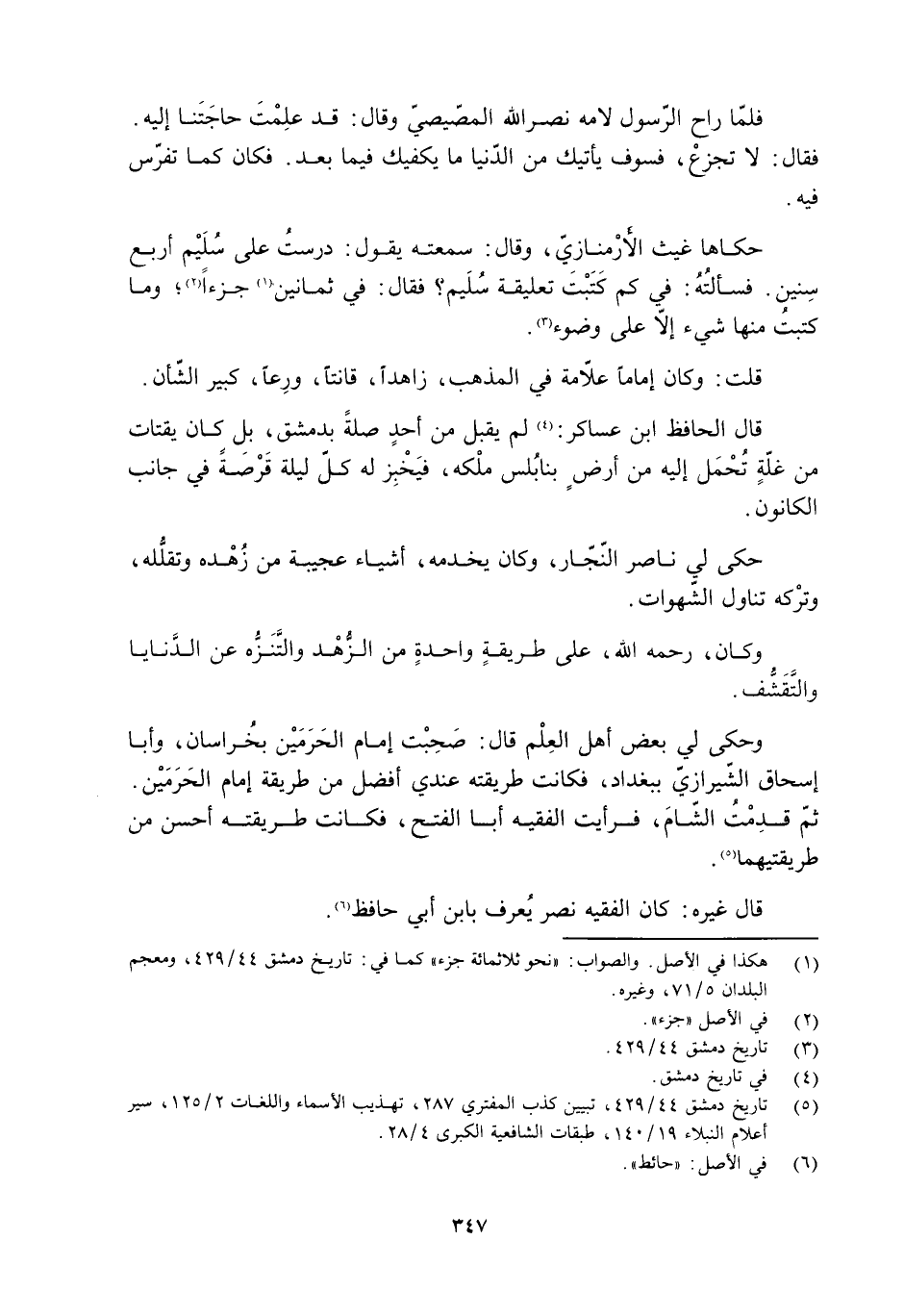 [1] هكذا في الأصل. والصواب: «نحو ثلاثمائة جزء» كما في: تاريخ دمشق 44/ 429، ومعجم البلدان 5/ 71، وغيره.