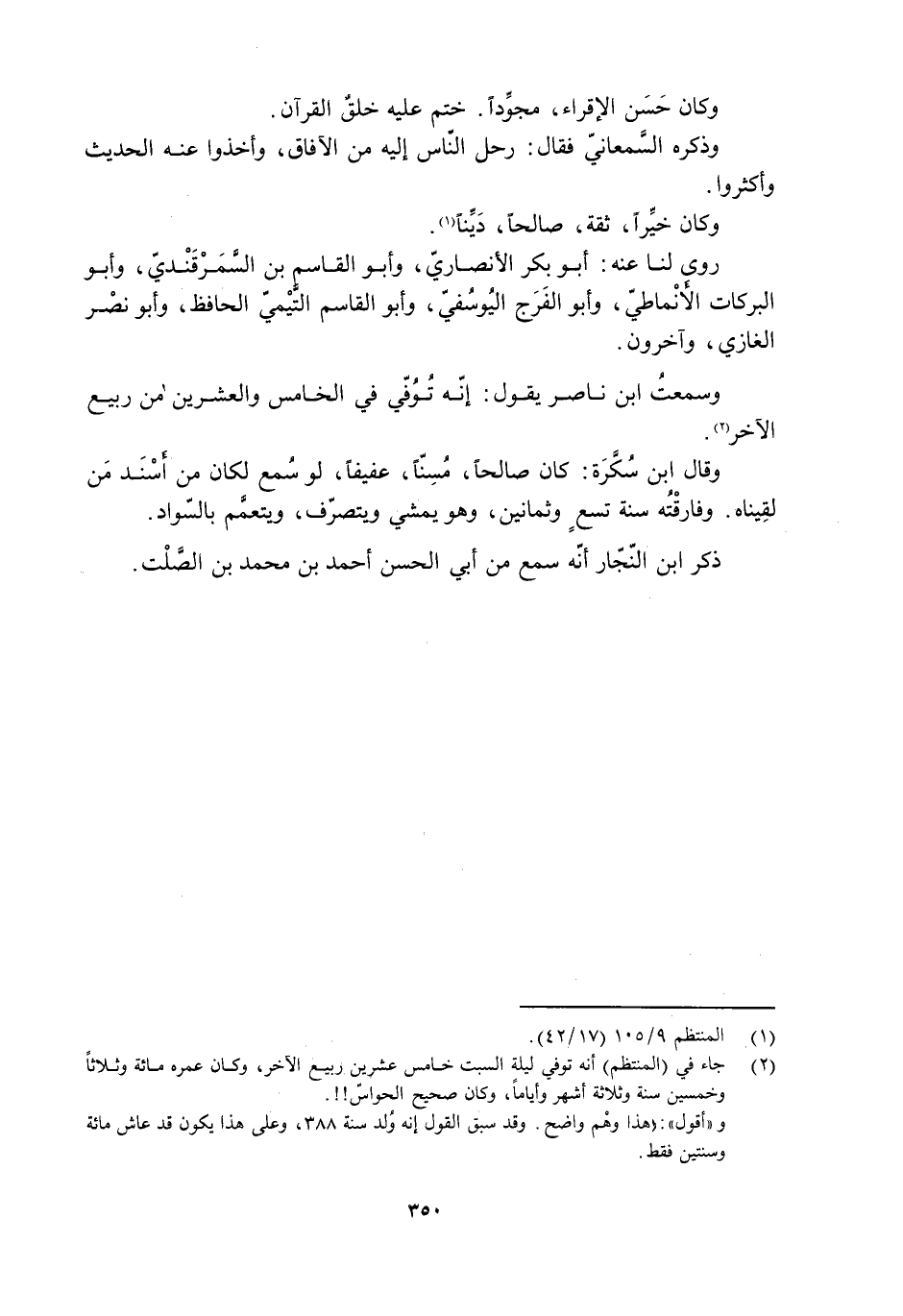 و «أقول» : هذا وهم واضح. وقد سبق القول إنه ولد سنة 388، وعلى هذا يكون قد عاش مائة وسنتين فقط.