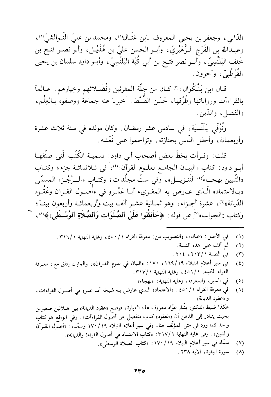 [4] في سير أعلام النبلاء 19/ 169، 170: «البيان في علوم القرآن» ، والمثبت يتفق مع: معرفة القراء الكبار 1/ 451، وغاية النهاية 1/ 317.