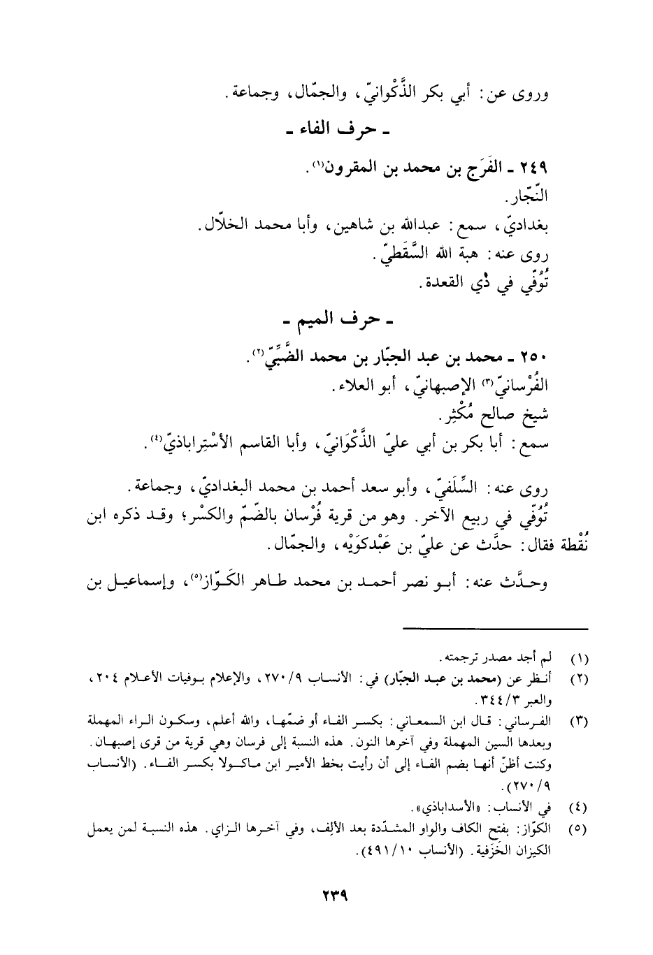 [3] الفرساني: قال ابن السمعاني: بكسر الفاء أو ضمّها، والله أعلم، وسكون الراء المهملة وبعدها السين المهملة وفي آخرها النون. هذه النسبة إلى فرسان وهي قرية من قرى أصبهان.