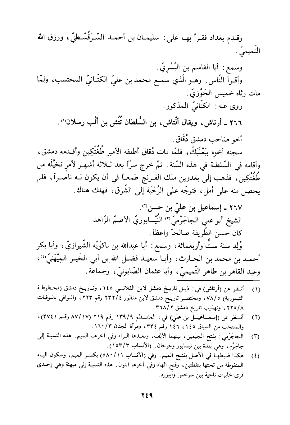 [1] انظر عن (أرتاش) في: ذيل تاريخ دمشق لابن القلانسي 145، وتاريخ دمشق (مخطوطة التيمورية) 5/ 78، ومختصر تاريخ دمشق لابن منظور 4/ 232 رقم 223، والوافي بالوفيات 8/ 225، وتهذيب تاريخ دمشق 2/ 368.