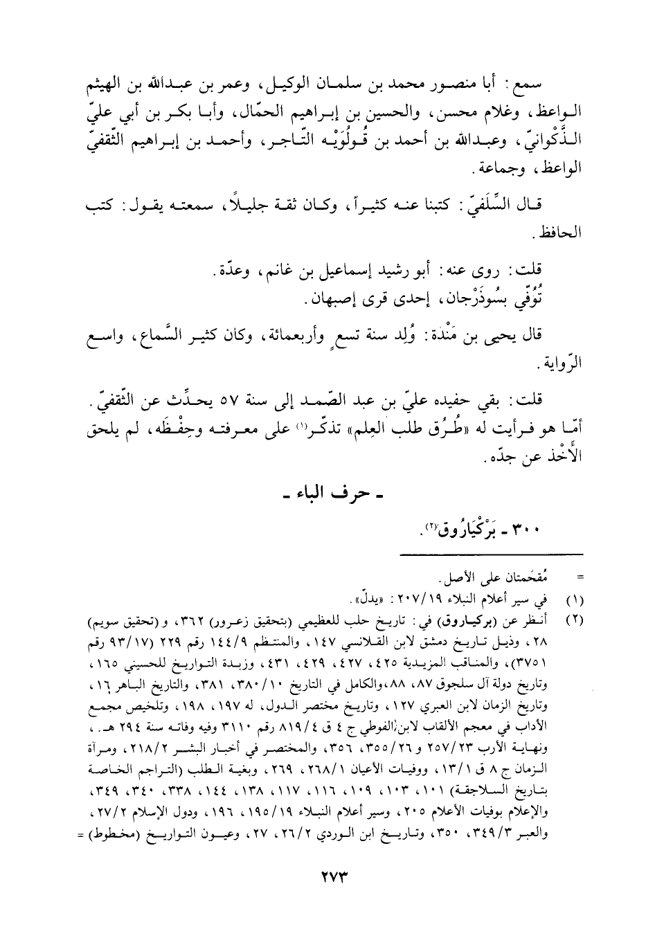 [2] انظر عن (بركياروق) في: تاريخ حلب للعظيميّ (بتحقيق زعرور) 362، و (تحقيق سويم) 28، وذيل تاريخ دمشق لابن القلانسي 147، والمنتظم 9/ 144 رقم 229 (17/ 93 رقم 3751) ، والمناقب المزيدية 425، 427، 429، 431، وزبدة التواريخ للحسيني 165، وتاريخ دولة آل سلجوق 87، 88، والكامل في التاريخ 10/ 380، 381، والتاريخ الباهر 16، وتاريخ الزمان لابن العبري 127، وتاريخ مختصر الدول، له 197، 198، وتلخيص مجمع الآداب في معجم الألقاب لابن الفوطي ج 4 ق 4/ 819 رقم 3110 وفيه وفاته سنة 294 هـ.، ونهاية الأرب 23/ 257 و 26/ 355، 356، والمختصر في أخبار البشر 2/ 218، ومرآة الزمان ج 8 ق 1/ 13، ووفيات الأعيان 1/ 268، 269، وبغية الطلب (التراجم الخاصة بتاريخ السلاجقة) 101، 103، 109، 116، 117، 138، 144، 338، 340، 349، والإعلام بوفيات الأعلام 205، وسير أعلام النبلاء 19/ 195، 196، ودول الإسلام 2/ 27، والعبر 3/ 349، 350، وتاريخ ابن الوردي 2/ 26، 27، وعيون التواريخ (مخطوط)