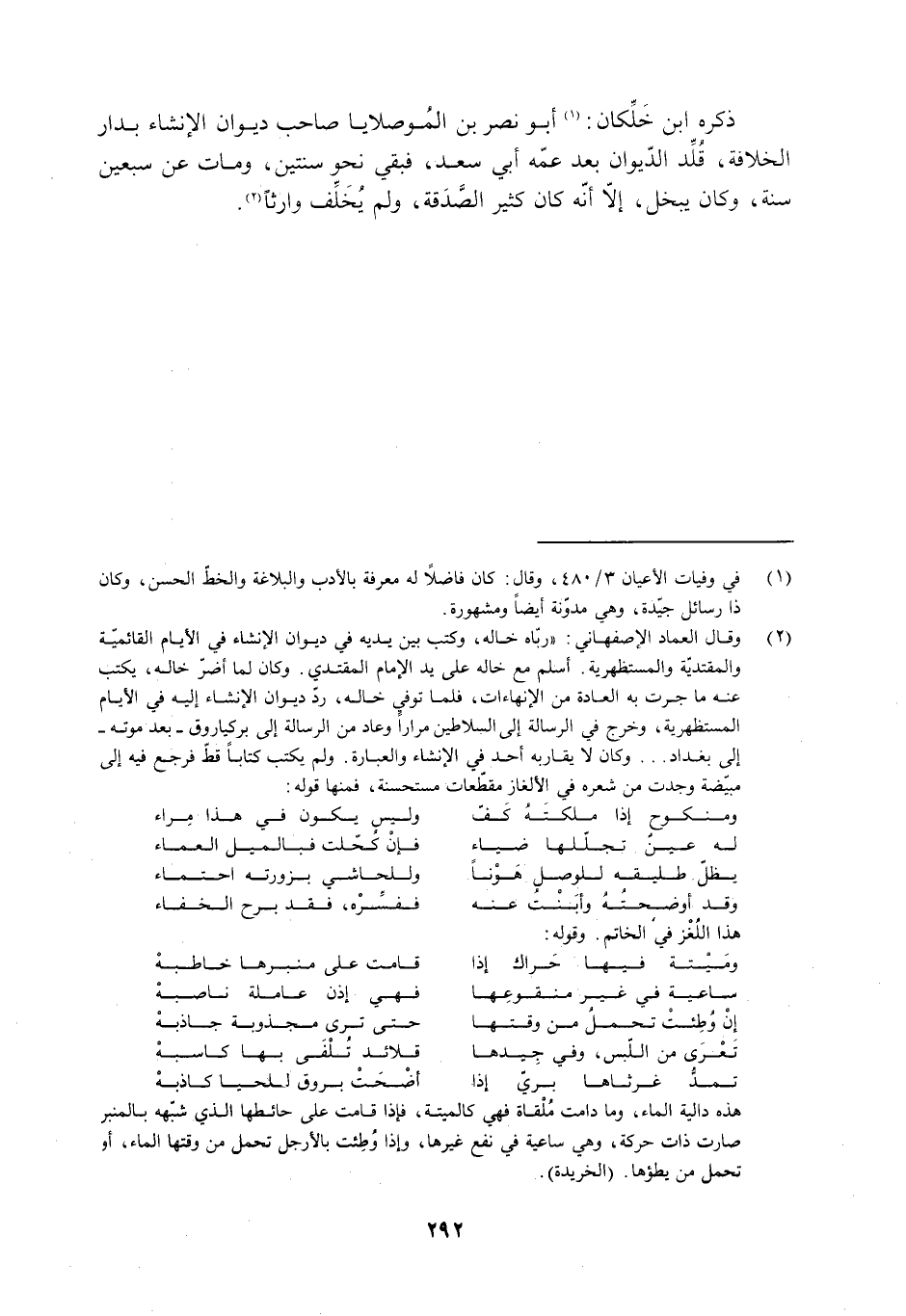 [1] في وفيات الأعيان 3/ 480، وقال: كان فاضلا له معرفة بالأدب والبلاغة والخطّ الحسن، وكان ذا رسائل جيّدة، وهي مدوّنة أيضا ومشهورة.