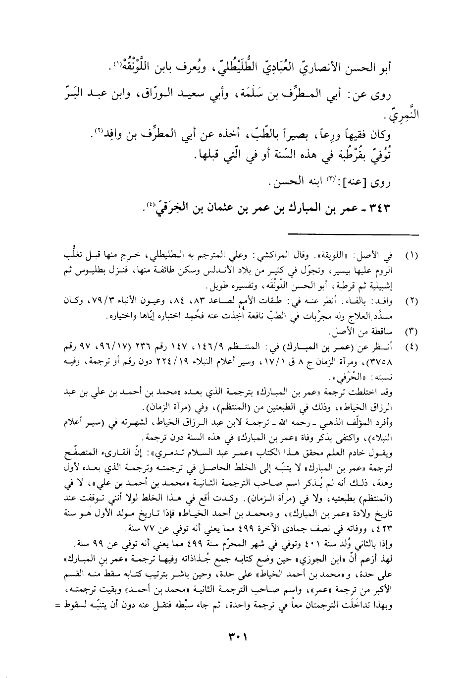 ويقول خادم العلم محقق هذا الكتاب «عمر عبد السلام تدمري» : إنّ القارئ المتصفّح لترجمة «عمر بن المبارك» لا يتنبّه إلى الخلط الحاصل في ترجمته وترجمة الّذي بعده لأول وهلة، ذلك أنه لم يذكر اسم صاحب الترجمة الثانية «محمد بن أحمد بن علي» ، لا في (المنتظم) بطبعتيه، ولا في (مرآة الزمان) . وكدت أقع في هذا الخلط لولا أنني توقفت عند تاريخ ولادة «عمر بن المبارك» ، و «محمد بن أحمد الخياط» فإذا تاريخ مولد الأول هو سنة 423، ووفاته في نصف جمادى الآخرة 499 مما يعني أنه توفي عن 77 سنة.