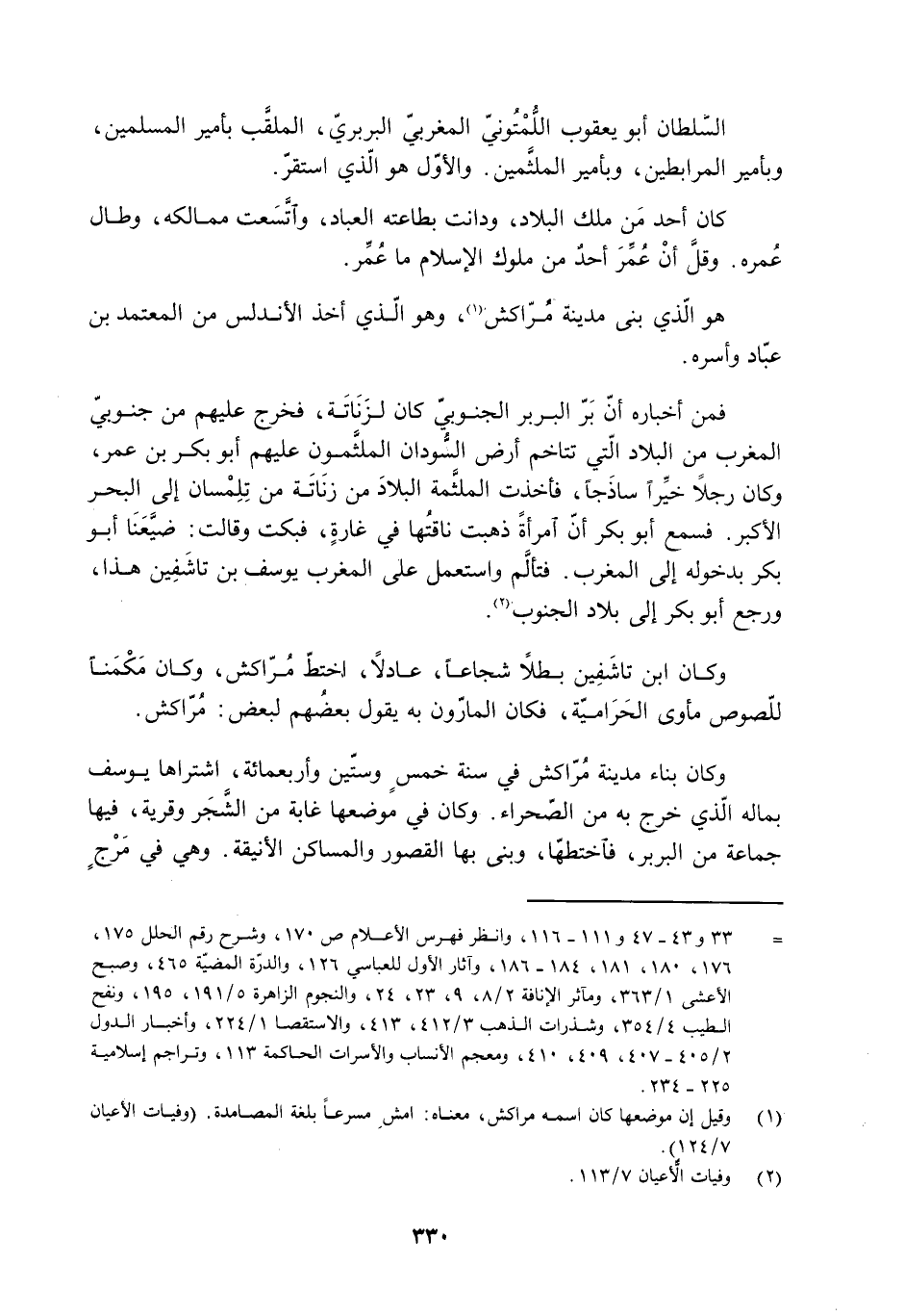 وكان ابن تاشَفِين بطلًا شجاعًا، عادلًا، اختطّ مراكش، وكان مكمنًا للّصوص مأوى الحَرَاميّة، فكان المارَون بِهِ يقول بعضُهم لبعض: مُرّاكش.
