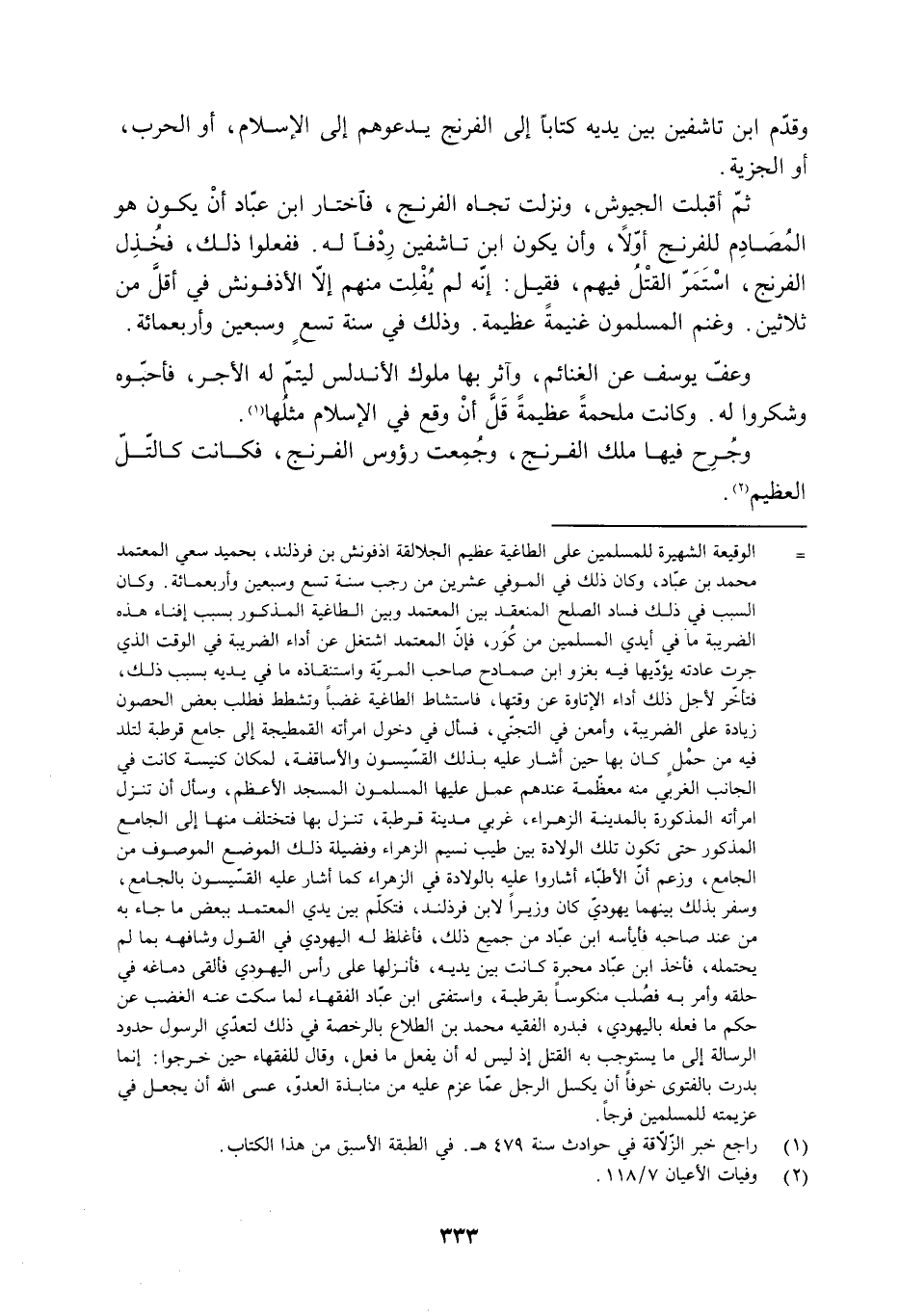 [ () ] الوقيعة الشهيرة للمسلمين على الطاغية عظيم الجلالقة اذفونش بن فرذلند، بحميد سعي المعتمد محمد بن عبّاد، وكان ذلك في الموفي عشرين من رجب سنة تسع وسبعين وأربعمائة. وكان السبب في ذلك فساد الصلح المنعقد بين المعتمد وبين الطاغية المذكور بسبب إفناء هذه الضريبة ما في أيدي المسلمين من كور، فإنّ المعتمد اشتغل عن أداء الضريبة في الوقت الّذي جرت عادته يؤدّيها فيه بغزو ابن صمادح صاحب المريّة واستنقاذه ما في يديه بسبب ذلك، فتأخّر لأجل ذلك أداء الإتاوة عن وقتها، فاستشاط الطاغية غضبا وتشطط فطلب بعض الحصون زيادة على الضريبة، وأمعن في التجنّي، فسأل في دخول امرأته القمطيجة إلى جامع قرطبة لتلد فيه من حمل كان بها حين أشار عليه بذلك القسّيسون والأساقفة، لمكان كنيسة كانت في الجانب الغربي منه معظّمة عندهم عمل عليها المسلمون المسجد الأعظم، وسأل أن تنزل امرأته المذكورة بالمدينة الزهراء، غربي مدينة قرطبة، تنزل بها فتختلف منها إلى الجامع المذكور حتى تكون تلك الولادة بين طيب نسيم الزهراء وفضيلة ذلك الموضع الموصوف من الجامع، وزعم أنّ الأطبّاء أشاروا عليه بالولادة في الزهراء كما أشار عليه القسّيسون بالجامع، وسفر بذلك بينهما يهوديّ كان وزيرا لابن فرذلند، فتكلّم بين يدي المعتمد ببعض ما جاء به من عند صاحبه فأيأسه ابن عبّاد من جميع ذلك، فأغلظ له اليهودي في القول وشافهه بما لم يحتمله، فأخذ ابن عبّاد محبرة كانت بين يديه، فأنزلها على رأس اليهودي فألقى دماغه في حلقه وأمر به فصلب منكوسا بقرطبة، واستفتى ابن عبّاد الفقهاء لما سكت عنه الغضب عن حكم ما فعله باليهودي، فبدره الفقيه محمد بن الطلاع بالرخصة في ذلك لتعدّي الرسول حدود الرسالة إلى ما يستوجب به القتل إذ ليس له أن يفعل ما فعل، وقال للفقهاء حين خرجوا: إنما بدرت بالفتوى خوفا أن يكسل الرجل عمّا عزم عليه من منابذة العدوّ، عسى الله أن يجعل في عزيمته للمسلمين فرجا.