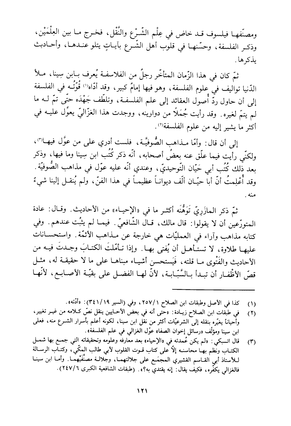 [2] في طبقات ابن الصلاح زيادة: «حتى أنه في بعض الأحايين ينقل نصّ كلامه من غير تغيير، وأحيانا يغيّره بنقله إلى الشرعيّات أكثر من نقل ابن سينا، لكونه أعلم بأسرار الشرع منه، فعلى ابن سينا ومؤلّف «رسائل إخوان الصفا» عوّل الغزالي في علم الفلسفة» .