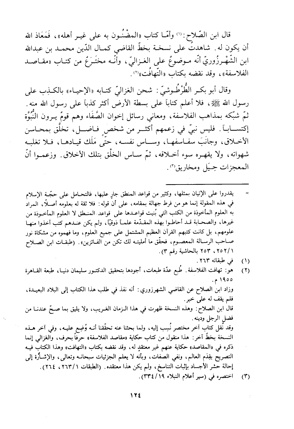 قَالَ ابن الصّلاح: [1] وأمّا كتاب «المضْنوُن بِهِ عَلَى غير أهله» ، فَمَعَاذ الله أن يكون لَهُ. شاهدتُ عَلَى نسخة بخطّ القاضي كمال الدِّين محمد بْن عَبْد الله ابن الشّهْرزُوريّ أنّه موضوعٌ عَلَى الغزاليّ، وأنّه مخَتَرعٌ مِن كتاب «مقاصد الفلاسفة» ، وقد نقضه بكتاب «التّهافُت» [2] .