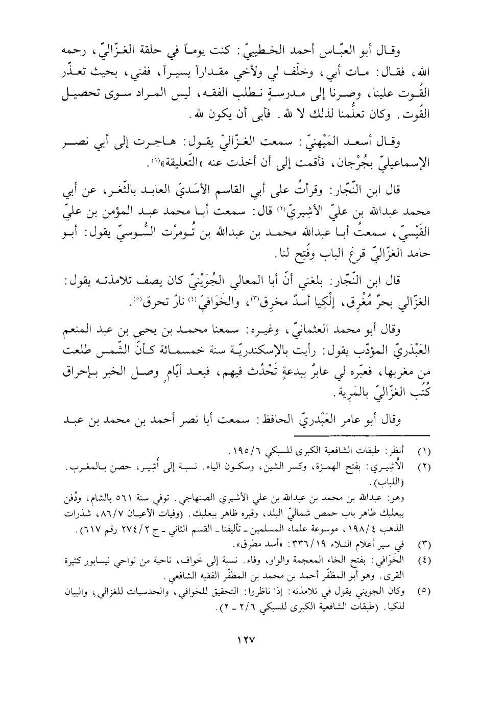 [5] وكان الجويني يقول في تلامذته: إذا ناظروا: التحقيق للخوافي، والحدسيات للغزالي، والبيان للكيا. (طبقات الشافعية الكبرى للسبكي 6/ 2- 2) .