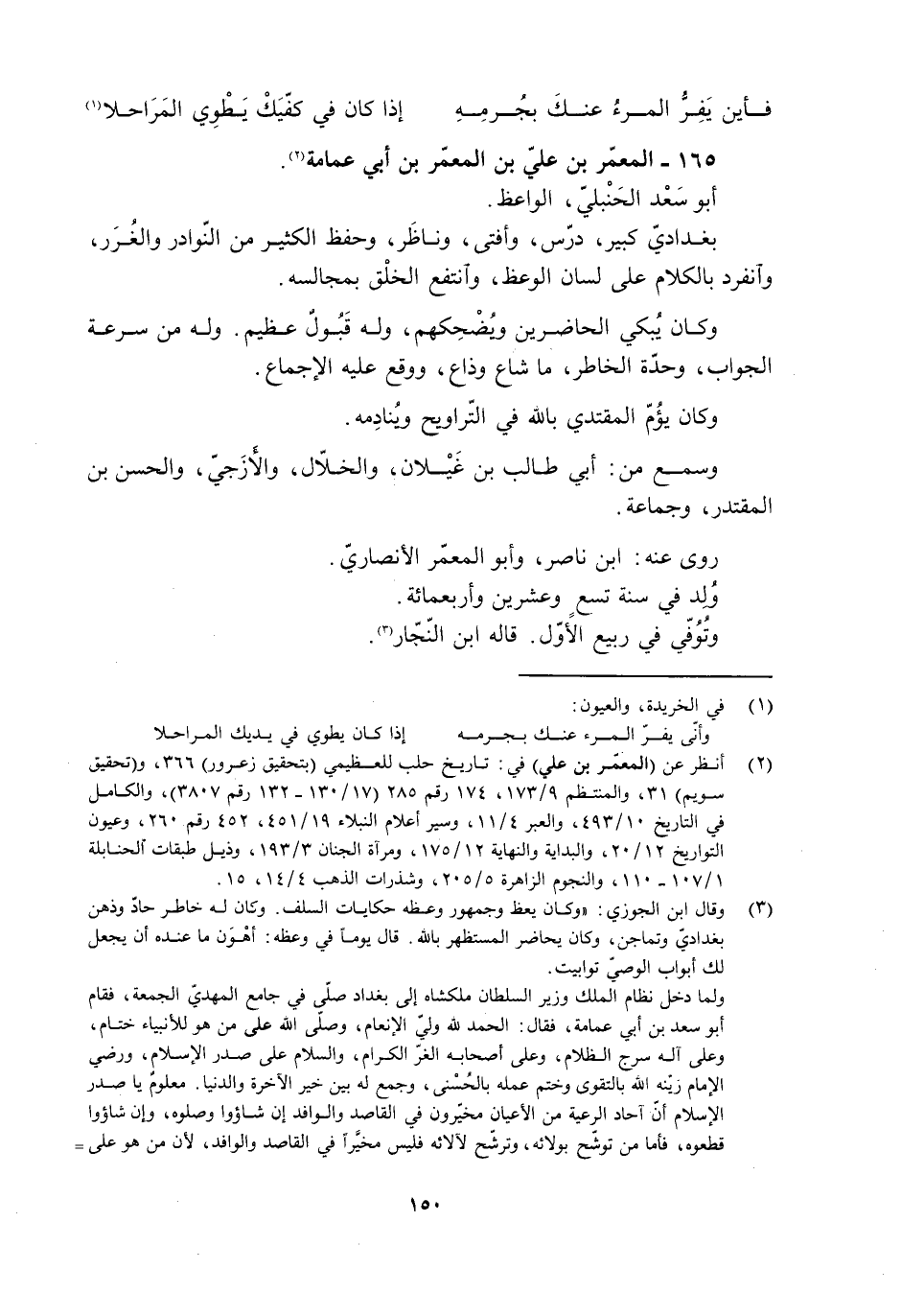 [2] انظر عن (المعمّر بن علي) في: تاريخ حلب للعظيميّ (بتحقيق زعرور) 366، و (تحقيق سويم) 31، والمنتظم 9/ 173، 174 رقم 285 (17/ 130- 132 رقم 3807) ، والكامل في التاريخ 10/ 493، والعبر 4/ 11، وسير أعلام النبلاء 19/ 451، 452 رقم 260، وعيون التواريخ 12/ 20، والبداية والنهاية 12/ 175، ومرآة الجنان 3/ 193، وذيل طبقات الحنابلة 1/ 107- 110، والنجوم الزاهرة 5/ 205، وشذرات الذهب 4/ 14، 15.