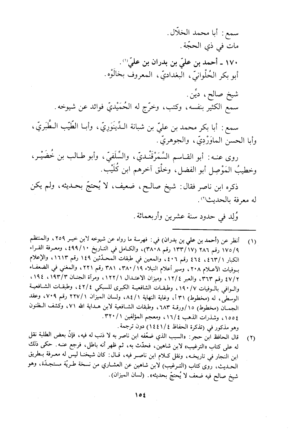 [1] انظر عن (أحمد بن علي بن بدران) في: فهرسة ما رواه عن شيوخه لابن خير 259، والمنتظم 9/ 175، رقم 286 (17/ 133 رقم 3808) ، والكامل في التاريخ 10/ 499، ومعرفة القراء الكبار 1/ 463، 464 رقم 406، والمعين في طبقات المحدّثين 149 رقم 1613، والإعلام بوفيات الأعلام 208، وسير أعلام النبلاء 19/ 380، 381 رقم 221، والمغني في الضعفاء 2/ 47 رقم 363، والعبر 4/ 12، وميزان الاعتدال 1/ 122، ومرآة الجنان 3/ 193، 194، والوافي بالوفيات 7/ 190، وطبقات الشافعية الكبرى للسبكي 4/ 42، وطبقات الشافعية الوسطى، له (مخطوط) 31 أ، وغاية النهاية 1/ 84، ولسان الميزان 1/ 227 رقم 709، وعقد الجمان (مخطوط) 15/ ورقة 683، وطبقات الشافعية لابن هداية الله 71، وكشف الظنون 1554، وشذرات الذهب 4/ 16، ومعجم المؤلفين 1/ 320.