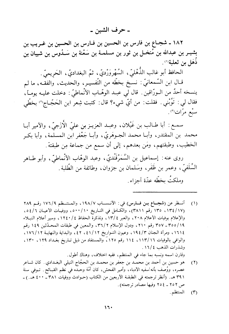 [1] انظر عن (شجاع بن فارس) في: الأنساب 7/ 198، والمنتظم 9/ 176 رقم 289 (17/ 134، 135 رقم 3811) ، والكامل في التاريخ 10/ 500، ووفيات الأعيان 6/ 54، والإعلام بوفيات الأعلام 208، والعبر 4/ 13، وتذكرة الحفاظ 4/ 1240، وسير أعلام النبلاء 19/ 355- 357 رقم 210، ودول الإسلام 2/ 36، والمعين في طبقات المحدّثين 149 رقم 1614، ومرآة الجنان 3/ 194، وعيون التواريخ 12/ 41، 42، والبداية والنهاية 12/ 176، والوافي بالوفيات 16/ 113، 114 رقم 125، والمستفاد من ذيل تاريخ بغداد 129، 130، وشذرات الذهب 4/ 16.