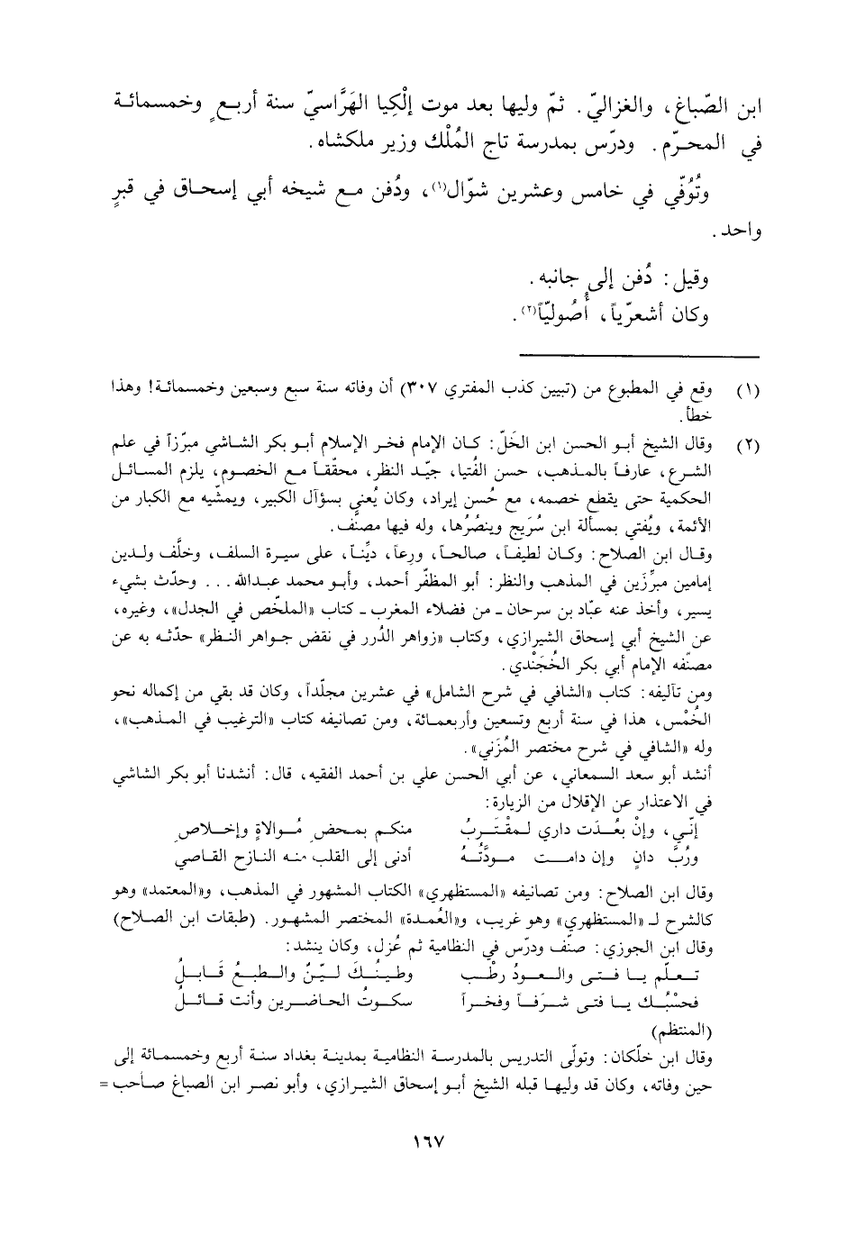 وقال ابن الصلاح: ومن تصانيفه «المستظهري» الكتاب المشهور في المذهب، و «المعتمد» وهو كالشرح ل «المستظهري» وهو غريب، و «العمدة» المختصر المشهور. (طبقات ابن الصلاح) وقال ابن الجوزي: صنّف ودرّس في النظامية ثم عزل، وكان ينشد: