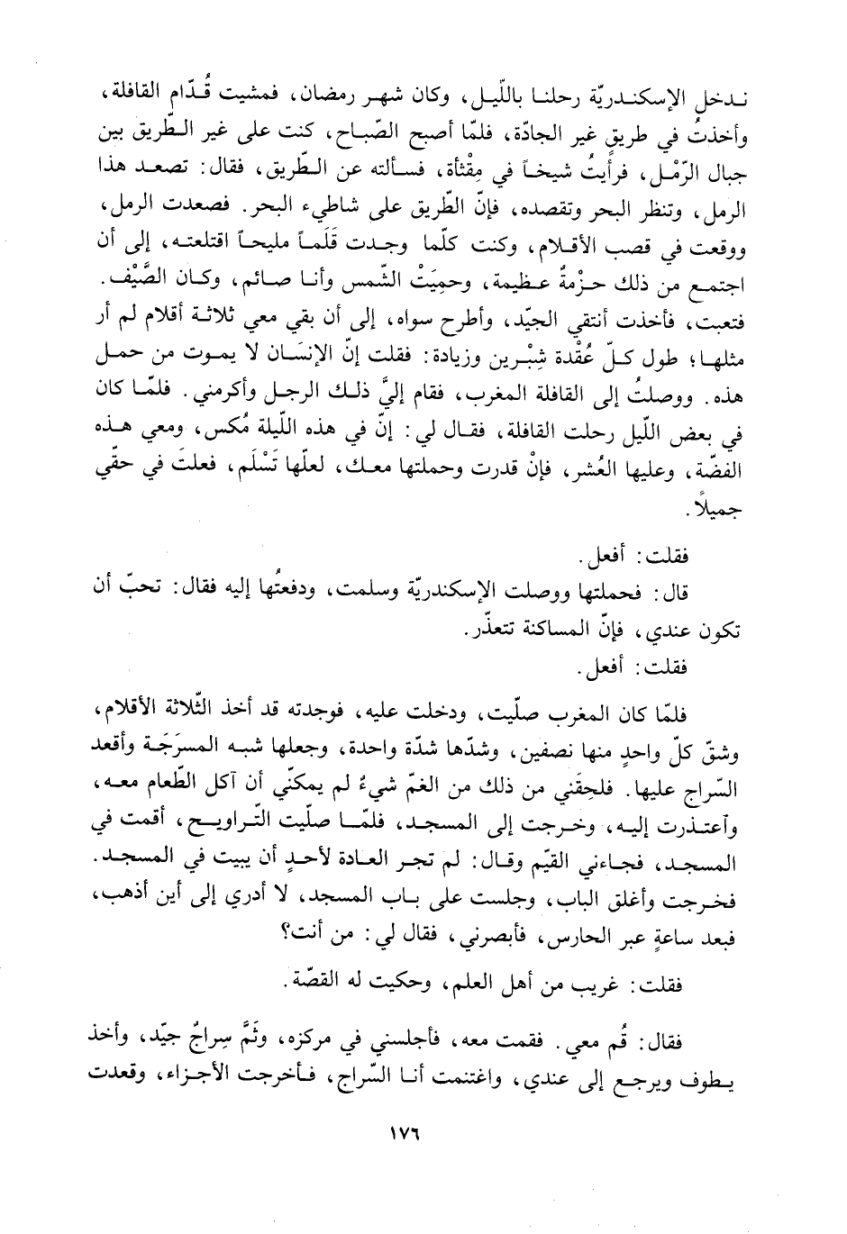 ندخل الإسكندريّة رحلنا باللّيل، وكان شهر رمضان، فمشيت قُدّام القافلة، وأخذتُ في طريق غير الجادّة، فلمّا أصبح الصّبّاح، كنت عَلَى غير الطّريق بين جبال الرّمْل، فرأيتُ شيخًا في مِقْثأة، فسألته عَنِ الطّريق، فقال: تصعد هذا الرمل، وتنظر البحر وتقصده، فإنّ الطريق عَلَى شاطئ البحر. فصعدت الرمل، ووقعت في قصب الأقلام، وكنت كلّما وجدت قلما مليحا اقتلعته، إلى أن اجتمع مِن ذَلِكَ حزْمة عظيمة، وحمِيَت الشمس وأنا صائم، وكان الصَّيْف.