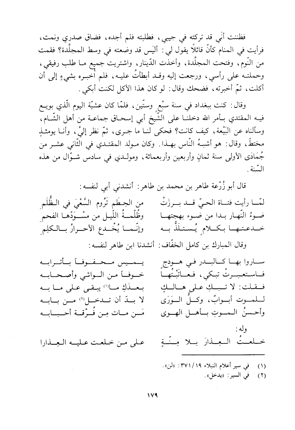 وقال: كنت ببغداد في سنة سبْعٍ وستّين، فلمّا كَانَ عشيّة اليوم الَّذِي بويع فيه المقتدي بأمر الله دخلنا عَلَى الشَّيْخ أَبِي إِسْحَاق جماعة مِن أهل الشّام، وسألناه عَنِ الْبَيْعة، كيف كانت؟ فحكى لنا ما جرى، ثمّ نظر إليَّ، وأنا يومئذٍ مختطّ، وقال: هُوَ أشبهُ النّاس بهذا. وكان مولد المقتدي في الثاني عشر مِن جمادي الأولى سنة ثمانٍ وأربعين وأربعمائة، ومولدي في سادس شوّال مِن هذه السّنة.