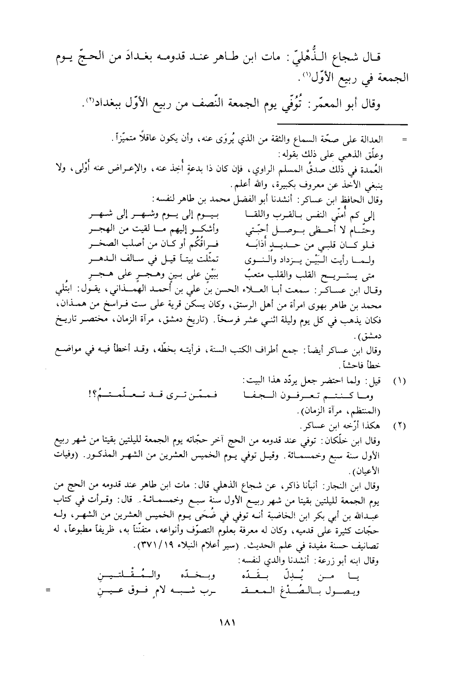 قَالَ شجاع الذُّهْليّ: مات ابن طاهر عند قدومه بغداد من الحجّ يوم الجمعة في ربيع الأوّل [1] .