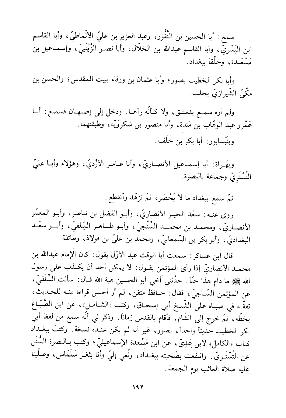 وأبا بَكْر الخطيب بصور، وأبا عثمان بْن ورقاء ببيت المقدس، والحسن بْن مكّيّ الشّيرازيّ بحلب.