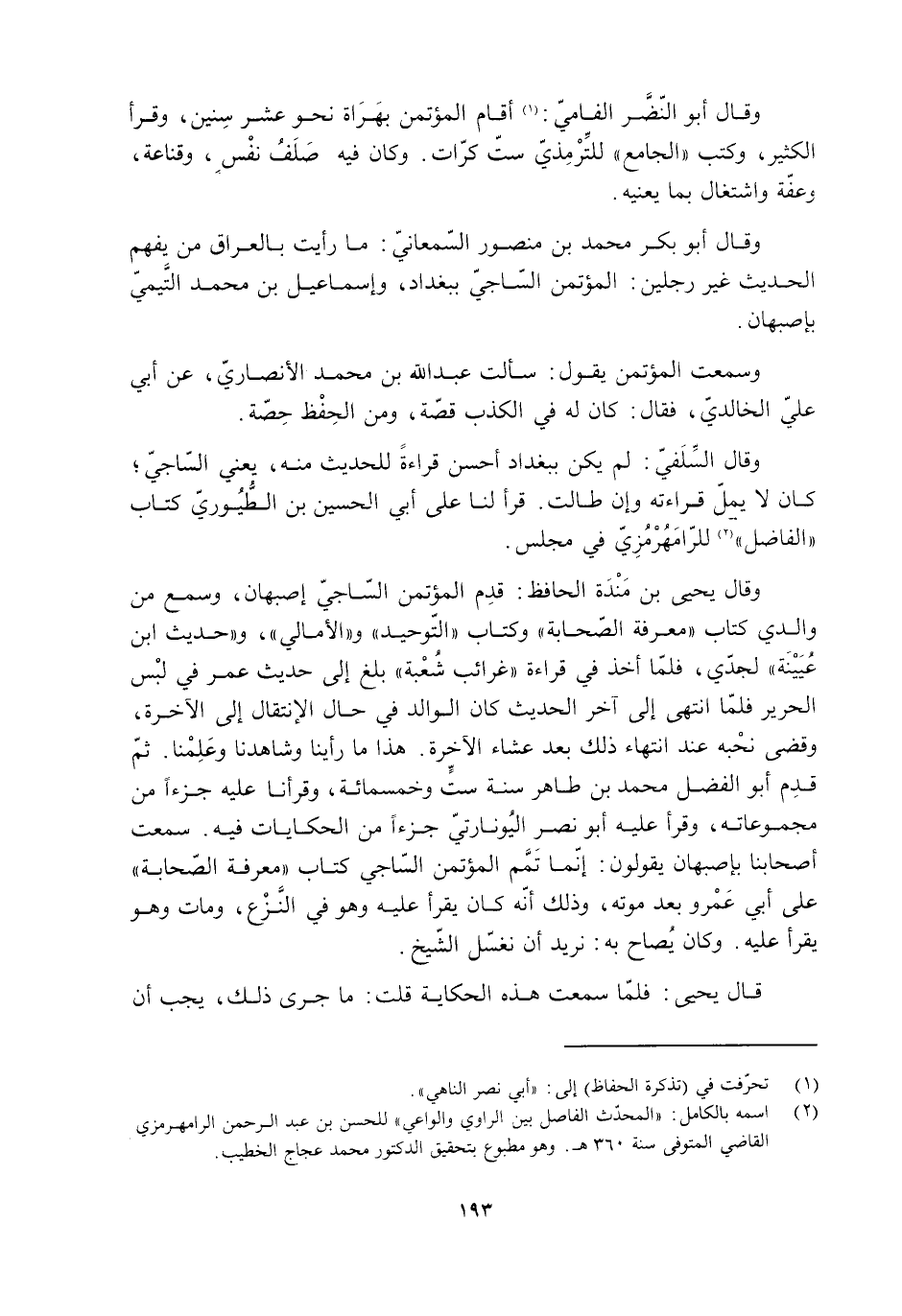 وقال السّلَفيّ: لم يكن ببغداد أحسن قراءةً للحديث منه، يعني السّاجيّ، كَانَ لَا يملّ قراءته وإن طالت. قرأ لنا عَلَى أَبِي الحُسَيْن بْن الطُّيُوريّ كتاب «الفاضل» [2] للرّامَهُرْمُزِيّ في مجلس.