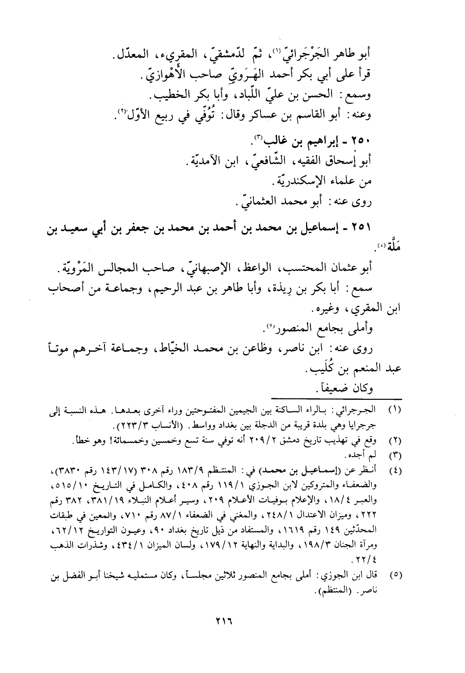 [4] انظر عن (إسماعيل بن محمد) في: المنتظم 9/ 183 رقم 308 (17/ 143 رقم 3830) ، والضعفاء والمتروكين لابن الجوزي 1/ 119 رقم 408، والكامل في التاريخ 10/ 515، والعبر 4/ 18، والإعلام بوفيات الأعلام 209، وسير أعلام النبلاء 19/ 381، 382 رقم 222، وميزان الاعتدال 1/ 248، والمغني في الضعفاء 1/ 87 رقم 710، والمعين في طبقات المحدّثين 149 رقم 1619، والمستفاد من ذيل تاريخ بغداد 90، وعيون التواريخ 12/ 62، ومرآة الجنان 3/ 198، والبداية والنهاية 12/ 179، ولسان الميزان 1/ 434، وشذرات الذهب 4/ 22.