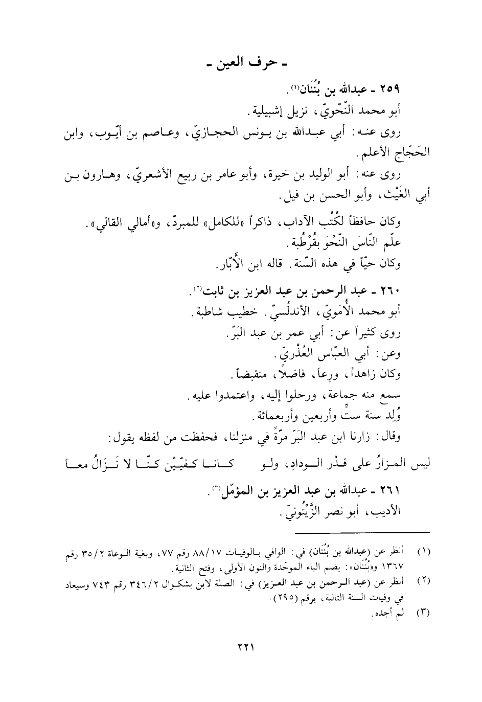 [2] انظر عن (عبد الرحمن بن عبد العزيز) في: الصلة لابن بشكوال 2/ 346 رقم 743 وسيعاد في وفيات السنة التالية، برقم (295) .
