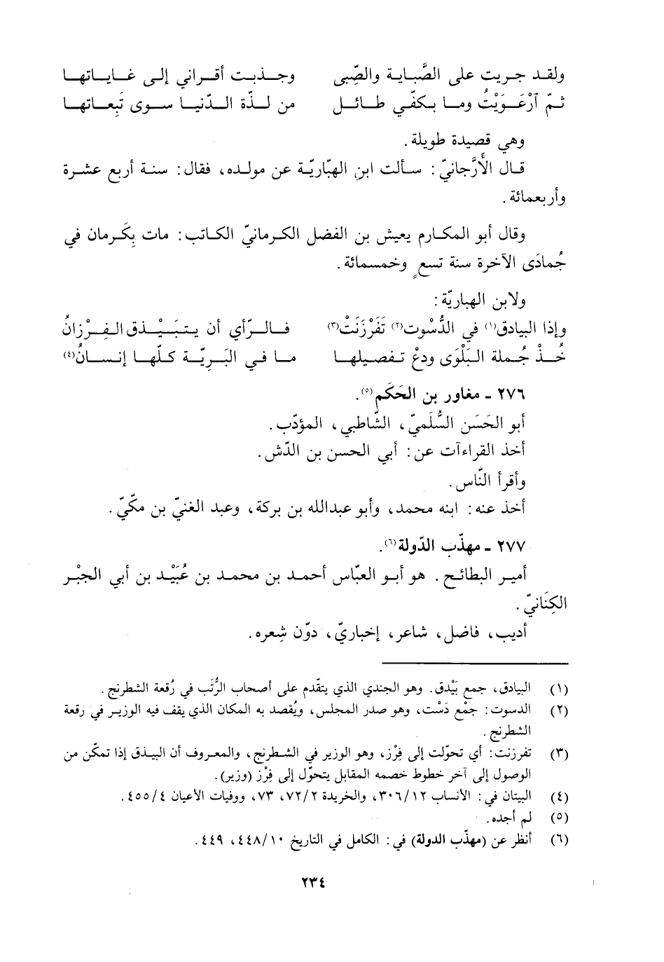 [4] البيتان في: الأنساب 12/ 306، والخريدة 2/ 72، 73، ووفيات الأعيان 4/ 455.