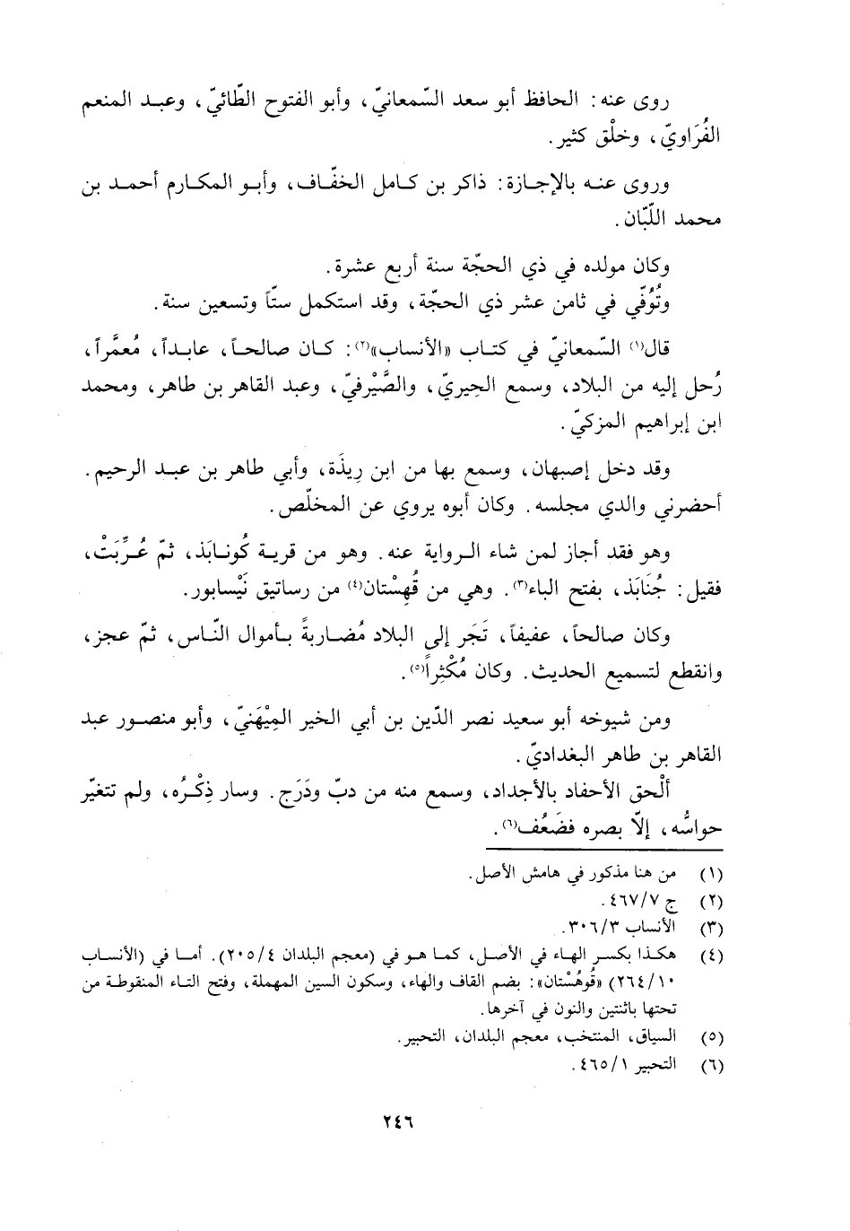 [4] هكذا بكسر الهاء في الأصل، كما هو في (معجم البلدان 4/ 205) . أما في (الأنساب 10/ 264) «قوهستان» : بضم القاف والهاء، وسكون السين المهملة، وفتح التاء المنقوطة من تحتها باثنتين والنون في آخرها.