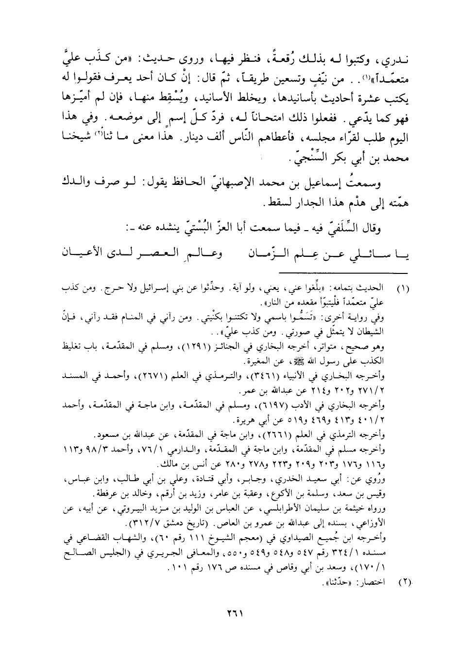 [1] الحديث بتمامه: «بلّغوا عني، يعني، ولو آية. وحدّثوا عن بني إسرائيل ولا حرج. ومن كَذَبَ عَلَيَّ مُتَعَمِّدًا فليتبوَّأ مَقْعَدَهُ مِنَ النَّارِ» . وفي رواية أخرى: «تسمّوا باسمي ولا تكتنوا بكنيتي. ومن رآني في المنام فقد رآني، فإنّ الشيطان لا يتمثّل في صورتي. ومن كذب عليّ» . وهو صحيح، متواتر، أخرجه البخاري في الجنائز (1291) ، ومسلم في المقدّمة، باب تغليظ الكذب على رسول الله صلى الله عليه وآله وسلم، عن المغيرة.