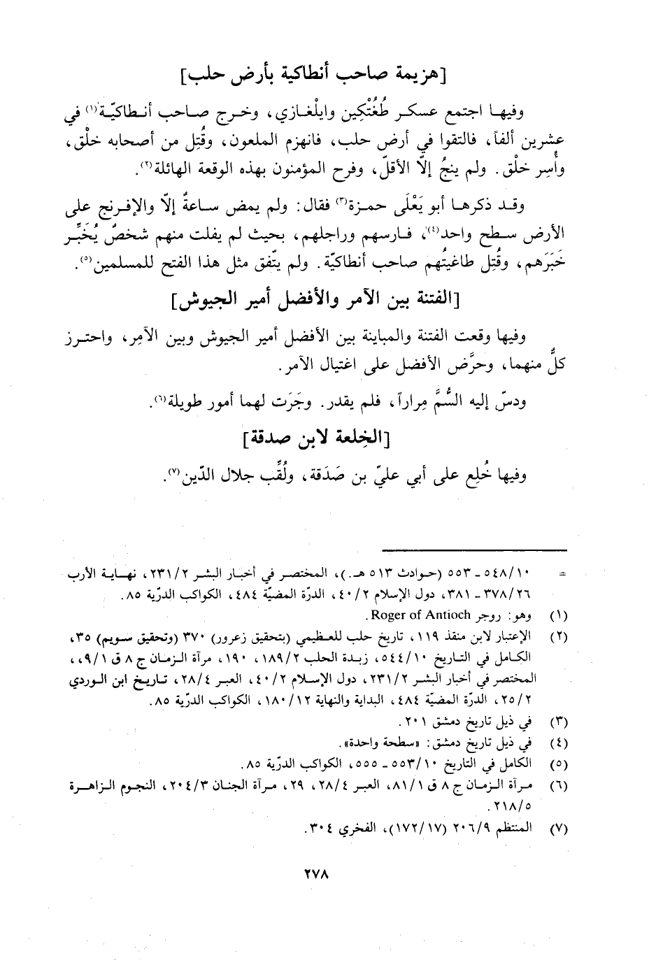 [2] الإعتبار لابن منقذ 119، تاريخ حلب للعظيميّ (بتحقيق زعرور) 370 (وتحقيق سويم) 35، الكامل في التاريخ 10/ 544، زبدة الحلب 2/ 189، 190، مرآة الزمان ج 8 ق 1/ 9، المختصر في أخبار البشر 2/ 231، دول الإسلام 2/ 40، العبر 4/ 28، تاريخ ابن الوردي 2/ 25، الدرّة المضيّة 484، البداية والنهاية 12/ 180، الكواكب الدرّية 85.