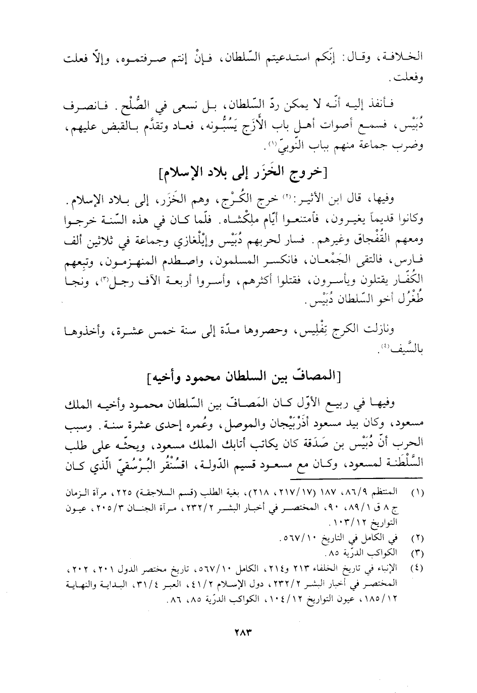 [1] المنتظم 9/ 86، 187 (17/ 217، 218) ، بغية الطلب (قسم السلاجقة) 225، مرآة الزمان ج 8 ق 1/ 89، 90، المختصر في أخبار البشر 2/ 232، مرآة الجنان 3/ 205، عيون التواريخ 12/ 103.