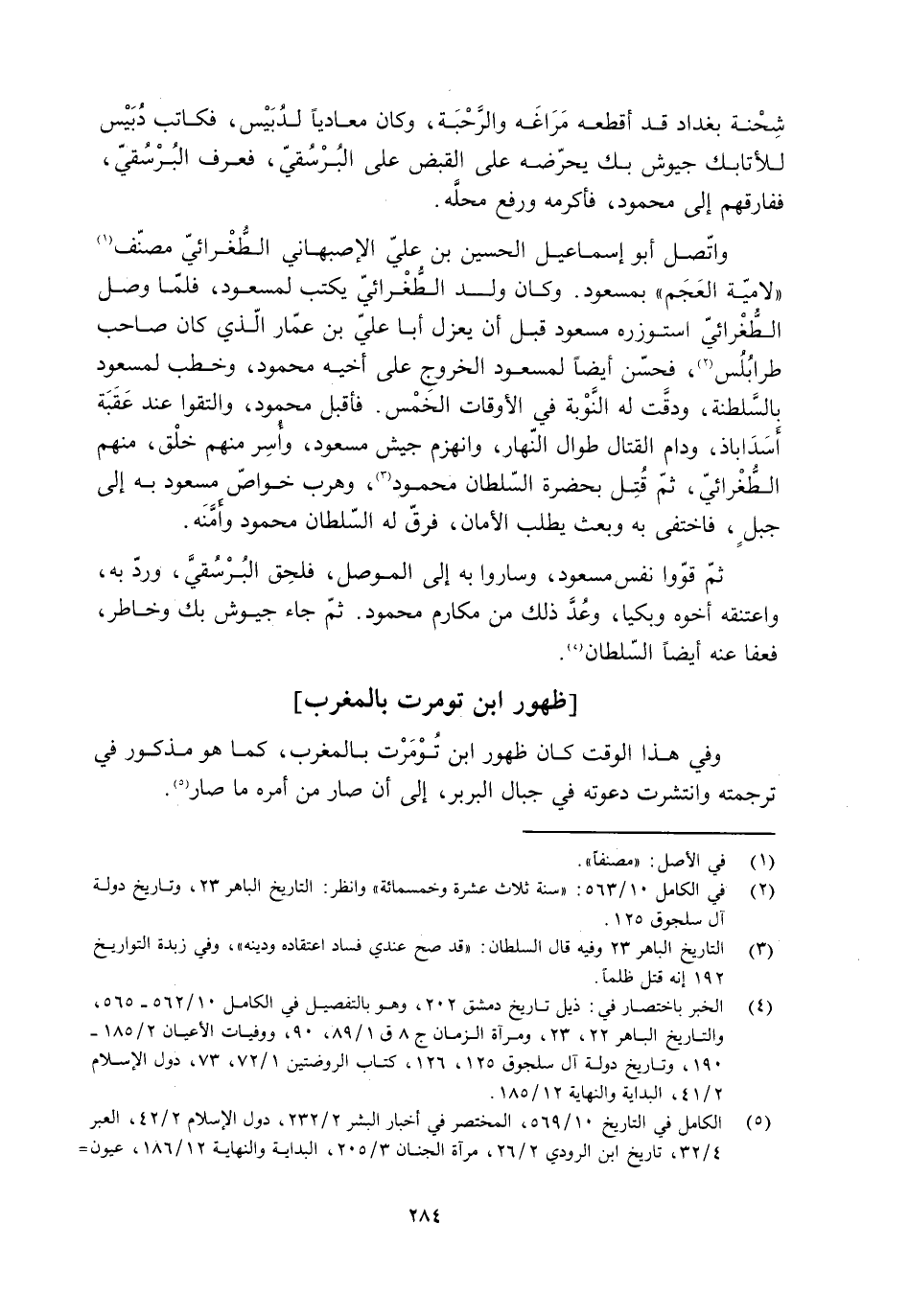 وفي هذا الوقت كَانَ ظهور ابن تُومَرْت بالمغرب، كما هُوَ مذكور في ترجمته وانتشرت دعوته في جبال البربر، إلى أن صار من أمره ما صار [5] .