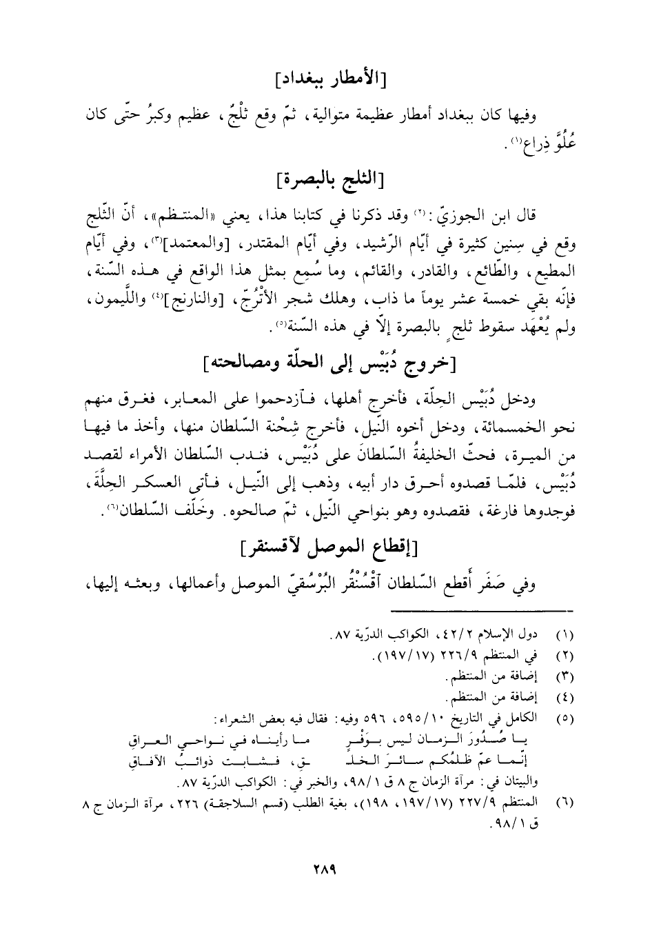 [6] المنتظم 9/ 227 (17/ 197، 198) ، بغية الطلب (قسم السلاجقة) 226، مرآة الزمان ج 8 ق 1/ 98.
